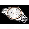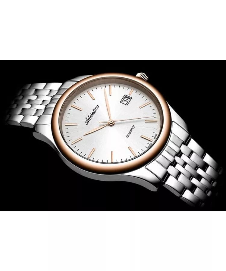 Часы Adriatica A1024.R113Q представляют собой идеальное сочетание элегантности и функциональности, разработанное для современных мужчин. Их стильный циферблат защищен сапфировым стекломСапфировое стеклоПрочный и надёжный материал из кристалла сапфира синтетического происхождения, характеризующийся особой твёрдостью и устойчивостью к царапинам и повреждениям., что придает дополнительную устойчивость к царапинам. Корпус из нержавеющей стали подчеркивает их изысканность и долговечность. Надежный кварцевый механизм с калибром RONDA 515 гарантирует точность времени, а водозащита WR 50 (5 ATM) обеспечивает защиту от воды в различных условиях. Браслет из нержавеющей стали с раскладной застёжкойРаскладная застёжкаТакой тип застёжки используется только на браслетах из металла. Она никогда не раскрывается полностью, происходит разделение на 2 и более частей. Раскладывающая застёжка снизит вероятность потери часов к минимуму., гармонично дополняет общий дизайн и обеспечивает комфортное ношение на запястье. Часы оснащены функцией отображения даты в окошке в положении 3 часа, что добавляет практичности в повседневной жизни. БезельБезельВнешний ободок, закрепляющий стекло. В спортивных часах так называется поворотное кольцо с делениями на циферблате, выполняет роль таймера – замеряет отрезки времени на шкале. Неподвижный безель – элемент декора. Однонаправленно вращающийся безель на дайверских часах позволяет фиксировать моменты погружения и выныривания на поверхность. с PVD-покрытиемPVDУльтратонкое покрытие наносится в технике вакуумного напыления, сочетает в себе нитрид титана особой прочности со слоем золота или оксида хрома. Несёт в себе декоративную или защитную функцию..