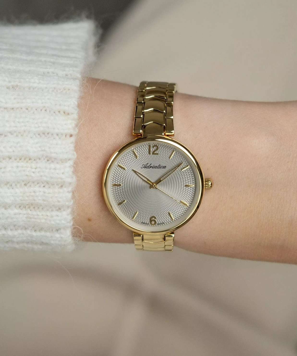 Женские часы Adriatica Essence A3790.1157Q имеют кварцевый механизм с высокой точностью. Минеральное стеклоМинеральное стеклоМинеральное стекло представляет собой искусственно выращенный минерал кварца. Такое стекло отличается особой устойчивостью к повреждениям и царапинам. Уступает по некоторым качествам сапфировому стеклу. обеспечивает надежную защиту серого циферблата, на котором расположились метки в виде штрихов и арабские цифры 6 и 12. Корпус часов изготовлен из нержавеющей стали с золотистым PVDPVDУльтратонкое покрытие наносится в технике вакуумного напыления, сочетает в себе нитрид титана особой прочности со слоем золота или оксида хрома. Несёт в себе декоративную или защитную функцию. покрытием, что придает часам утонченный и стильный вид. Браслет из нержавеющей стали с золотистым PVDPVDУльтратонкое покрытие наносится в технике вакуумного напыления, сочетает в себе нитрид титана особой прочности со слоем золота или оксида хрома. Несёт в себе декоративную или защитную функцию. покрытием и раскладной застёжкойРаскладная застёжкаТакой тип застёжки используется только на браслетах из металла. Она никогда не раскрывается полностью, происходит разделение на 2 и более частей. Раскладывающая застёжка снизит вероятность потери часов к минимуму., гармонично дополняет общий дизайн и обеспечивает комфортное ношение на запястье. Надежный кварцевый механизм с калибром RONDA 763 гарантирует точность времени, а водозащита WR 30 (3 ATM) делает эти часы практичным выбором для повседневного использования.