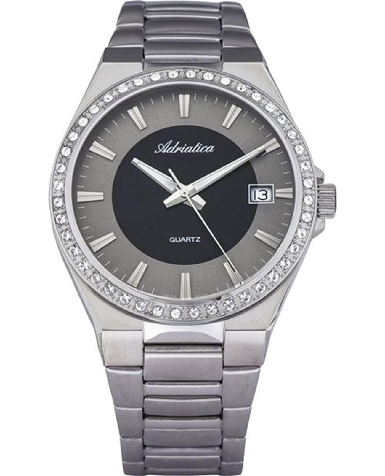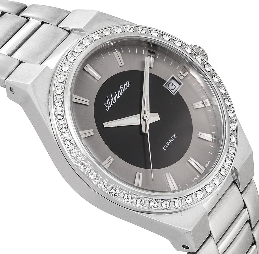 Женские швейцарские часы с минеральным стекломМинеральное стеклоМинеральное стекло представляет собой искусственно выращенный минерал кварца. Такое стекло отличается особой устойчивостью к повреждениям и царапинам. Уступает по некоторым качествам сапфировому стеклу. Adriatica A3804.5114QZ, кварцевый механизм, работающим от батарейки с высокой точностью. Класс водозащиты: 50 метров, позволит защитить корпус от случайных брызг или капель дождя. Корпус и браслет часов изготовлен из стали .Окошко даты находится в положении 3 часа.Стальной браслет на раскладной застёжкеРаскладная застёжкаТакой тип застёжки используется только на браслетах из металла. Она никогда не раскрывается полностью, происходит разделение на 2 и более частей. Раскладывающая застёжка снизит вероятность потери часов к минимуму.. Стрелки с люминесцентным покрытиемЛюминесцентное покрытиеПозволяет считывать показания времени в темноте. Производители наносят на стрелки, часовые индексы, безель или поверхность циферблата светонакопительный состав, дающий холодное свечение..БезельБезельВнешний ободок, закрепляющий стекло. В спортивных часах так называется поворотное кольцо с делениями на циферблате, выполняет роль таймера – замеряет отрезки времени на шкале. Неподвижный безель – элемент декора. Однонаправленно вращающийся безель на дайверских часах позволяет фиксировать моменты погружения и выныривания на поверхность.  инкрустирован цирконами.