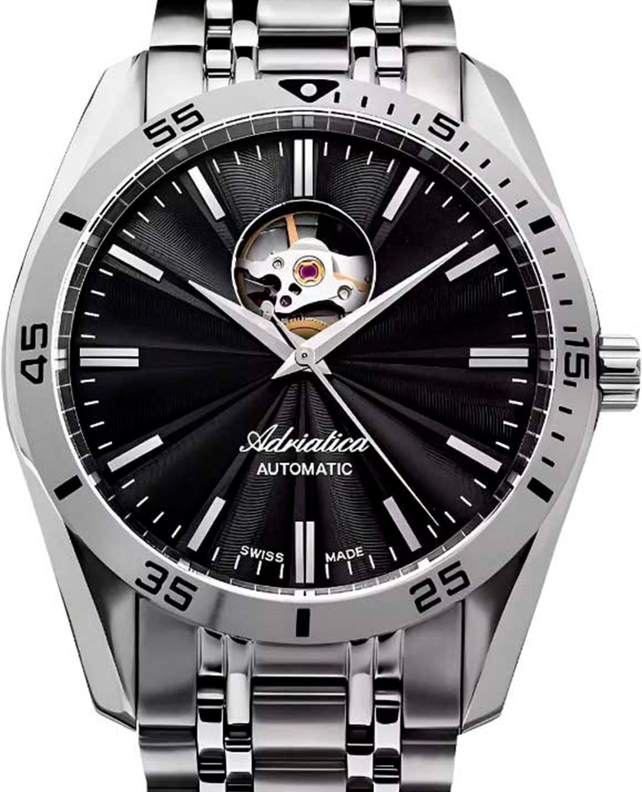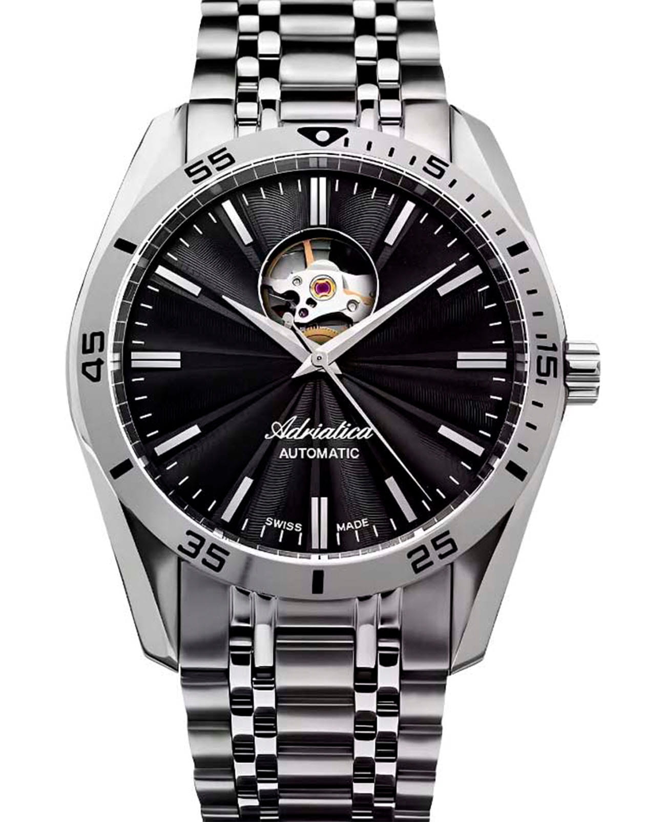 Мужские механические часы Adriatica A8202.5114A с автоподзаводом — это швейцарское качество и техническая изысканность. Корпус круглой формы выполнен из нержавеющей стали и защищён сапфировым стекломСапфировое стеклоПрочный и надёжный материал из кристалла сапфира синтетического происхождения, характеризующийся особой твёрдостью и устойчивостью к царапинам и повреждениям.. Циферблат чёрного цвета с штриховыми метками дополнен прозрачным окошком, через который можно наблюдать за работой механизма. Часы оснащены механизмом калибра Soprod P024 с 25 драгоценными камнями, обеспечивающими плавность хода и долговечность. Прозрачная задняя крышка раскрывает внутреннее устройство, подчёркивая мастерство швейцарского производства. Браслет из нержавеющей стали фиксируется на раскладной застёжкеРаскладная застёжкаТакой тип застёжки используется только на браслетах из металла. Она никогда не раскрывается полностью, происходит разделение на 2 и более частей. Раскладывающая застёжка снизит вероятность потери часов к минимуму.. Водонепроницаемость 100 м позволяет использовать часы для плавания, ныряния и других водных видов спорта. Модель сочетает в себе современный дизайн, надёжность и элегантность, оставаясь идеальным выбором для ценителя качественных механических часов.