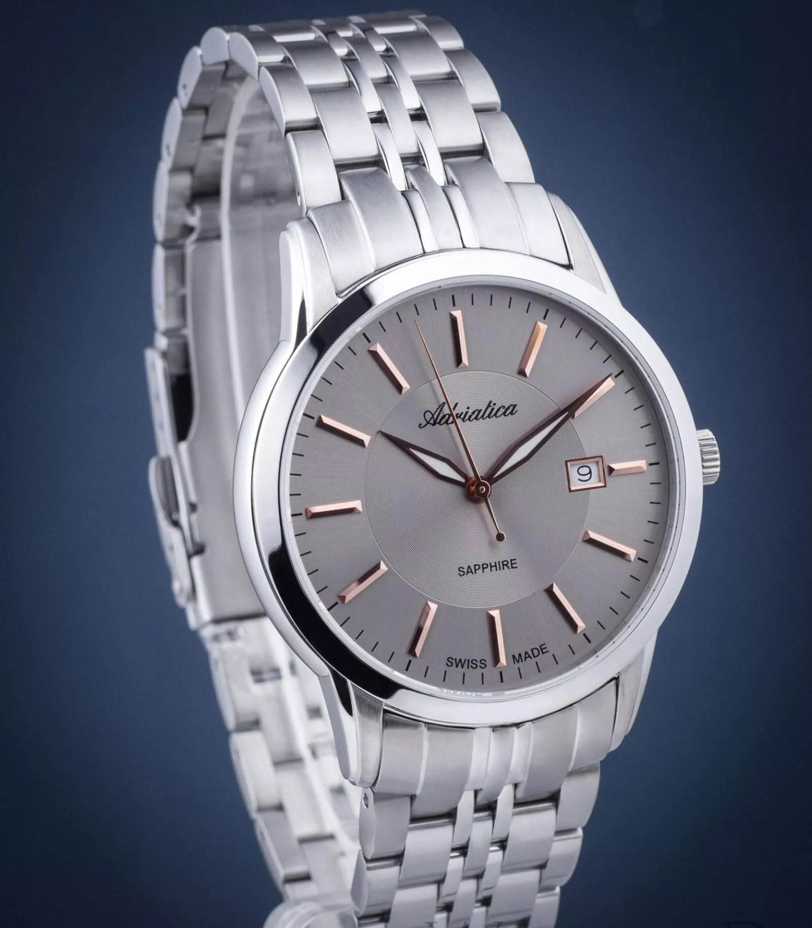 Мужские швейцарские кварцевые часы Adriatica Essence A8306.51R7Q, кварцевый механизм с высокой точностью. Сапфировое стеклоСапфировое стеклоПрочный и надёжный материал из кристалла сапфира синтетического происхождения, характеризующийся особой твёрдостью и устойчивостью к царапинам и повреждениям. устойчивое к появлению царапин, обладающее высокой прозрачностью. Класс водозащиты: 50 метров, позволит защитить корпус от случайных брызг или капель дождя. Корпус часов изготовлен из стали. Стальной браслет на раскладной застёжкеРаскладная застёжкаТакой тип застёжки используется только на браслетах из металла. Она никогда не раскрывается полностью, происходит разделение на 2 и более частей. Раскладывающая застёжка снизит вероятность потери часов к минимуму.. Стрелки с люминесцентным покрытиемЛюминесцентное покрытиеПозволяет считывать показания времени в темноте. Производители наносят на стрелки, часовые индексы, безель или поверхность циферблата светонакопительный состав, дающий холодное свечение.. Окошко даты находится в положении 3 часа.