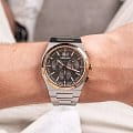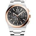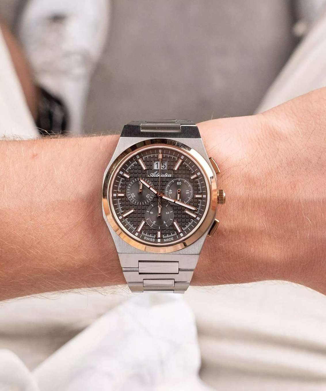 Мужские швейцарские часы-хронографХронографФункция позволяет измерять отрезки времени с особой точностью: часы, минуты, секунды. Верным признаком хронографа является наличие на циферблате 3 дополнительных окошек-счётчиков. с секундомеромСекундомерСекундоме́р — прибор, способный измерять интервалы времени с точностью до долей секунды. Adriatica Premiere A8326.R116CH воплощают в себе элегантность и функциональность, идеально подходящие для современных мужчин, ценящих швейцарское качество. Их черный циферблат защищенный сапфировым стекломСапфировое стеклоПрочный и надёжный материал из кристалла сапфира синтетического происхождения, характеризующийся особой твёрдостью и устойчивостью к царапинам и повреждениям., заключен в корпус из нержавеющей стали диаметром 40 мм и толщиной 10 мм, а на безельБезельВнешний ободок, закрепляющий стекло. В спортивных часах так называется поворотное кольцо с делениями на циферблате, выполняет роль таймера – замеряет отрезки времени на шкале. Неподвижный безель – элемент декора. Однонаправленно вращающийся безель на дайверских часах позволяет фиксировать моменты погружения и выныривания на поверхность. нанесено PVDPVDУльтратонкое покрытие наносится в технике вакуумного напыления, сочетает в себе нитрид титана особой прочности со слоем золота или оксида хрома. Несёт в себе декоративную или защитную функцию. покрытие. Надежный кварцевый механизм с калибром Ronda 5040.B обеспечивает высокую точность, а водозащита 5 ATM делает часы устойчивыми к воздействию воды. Стальной браслет с раскладной застёжкойРаскладная застёжкаТакой тип застёжки используется только на браслетах из металла. Она никогда не раскрывается полностью, происходит разделение на 2 и более частей. Раскладывающая застёжка снизит вероятность потери часов к минимуму. обеспечивает комфортное и надежное ношение. Фактурный циферблат с метками в виде штрихов дополнен рисунком в клетку, а окошко даты находится в положении 12 часов, что добавляет практичности в повседневной жизни. Люминесцентное покрытиеЛюминесцентное покрытиеПозволяет считывать показания времени в темноте. Производители наносят на стрелки, часовые индексы, безель или поверхность циферблата светонакопительный состав, дающий холодное свечение. на стрелках и метках обеспечивает отличную видимость в темноте.