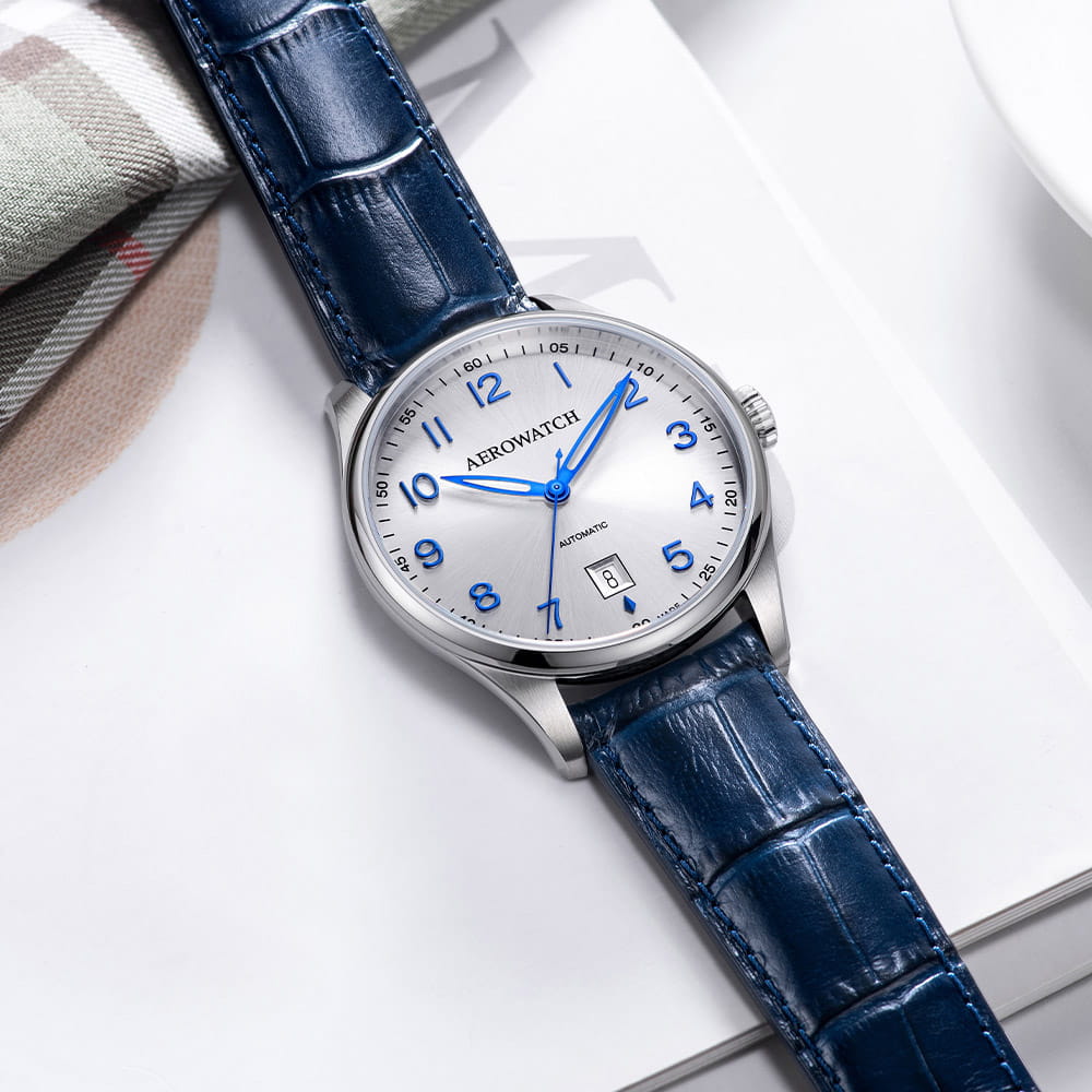 Мужские механические швейцарские часы с автоподзаводом Aerowatch Les Grandes Classiques 60996 AA01. Сапфировое стеклоСапфировое стеклоПрочный и надёжный материал из кристалла сапфира синтетического происхождения, характеризующийся особой твёрдостью и устойчивостью к царапинам и повреждениям. устойчивое к появлению царапин, обладающее высокой прозрачностью. Корпус изготовлен из нержавеющей стали. В часах установлен калибр 2824-2 ETA с 25 камнями, ротором. Серебристый sunray циферблат украшен синими арабскими цифрами и скелетонизированными стрелками, окошко даты в положении 6 часов. Класс водозащиты: 50 метров, позволит защитить корпус от случайных брызг или капель дождя. Кожаный ремешок на стандартной застёжке.