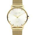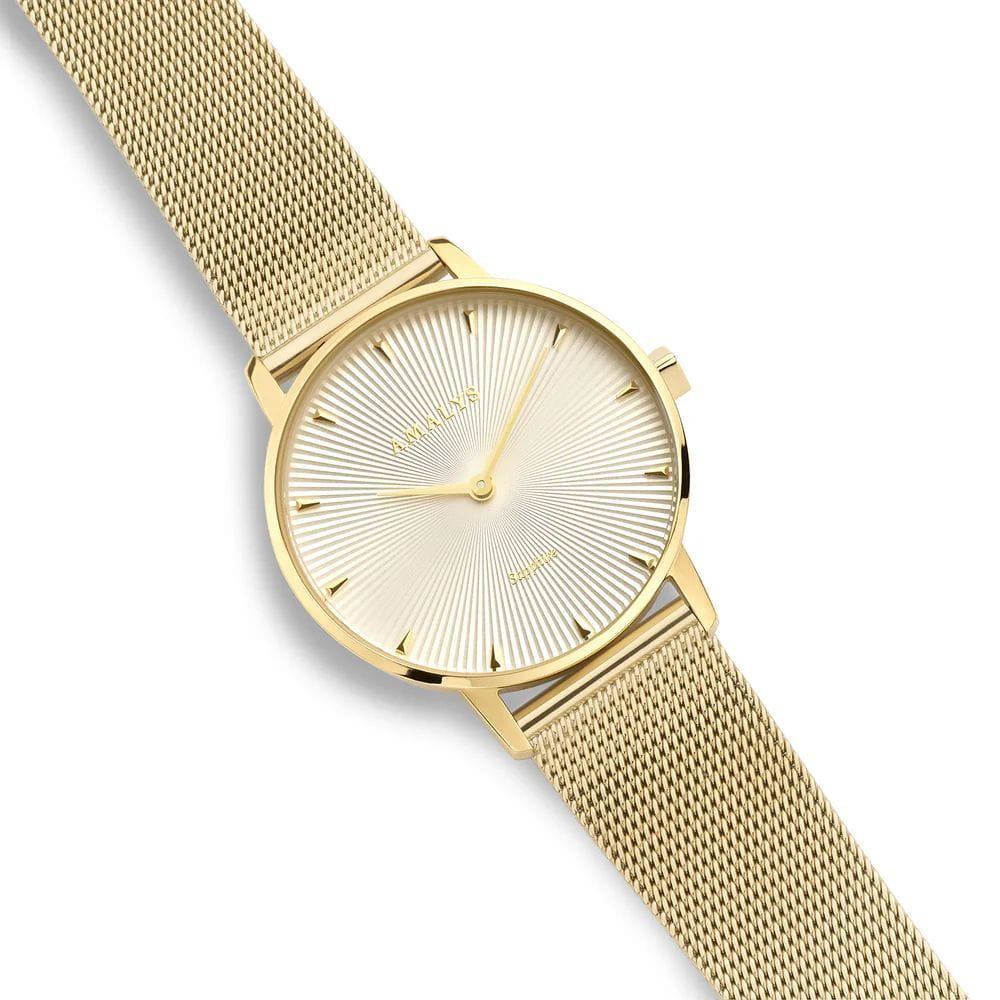 Amalys AMW-174 — женская модель с утончённым классическим дизайном, в которой сочетаются элегантность и практичность. Круглый корпус диаметром 33 мм выполнен из нержавеющей стали с PVD-покрытиемPVDУльтратонкое покрытие наносится в технике вакуумного напыления, сочетает в себе нитрид титана особой прочности со слоем золота или оксида хрома. Несёт в себе декоративную или защитную функцию., гармонирующим с браслетом шириной 16 мм в том же исполнении. Защитную функцию выполняет сапфировое стеклоСапфировое стеклоПрочный и надёжный материал из кристалла сапфира синтетического происхождения, характеризующийся особой твёрдостью и устойчивостью к царапинам и повреждениям., стойкое к царапинам и сохраняющее прозрачность. Механизм — кварцевый, обеспечивающий точность и стабильность хода. Браслет миланского плетения с PVD-покрытиемPVDУльтратонкое покрытие наносится в технике вакуумного напыления, сочетает в себе нитрид титана особой прочности со слоем золота или оксида хрома. Несёт в себе декоративную или защитную функцию. снабжён раскладным замкомРаскладной замокДанный вариант застежки используется только на часах с металлическим браслетом. Отличительная особенность такого крепления в том, что длина браслета становится универсальной и вы можете самостоятельно отрегулировать нужный вам размер – застежка просто двигается по браслету часов., который сочетает надёжность фиксации и удобство повседневного использования. Водозащита 3 ATM защищает часы от случайных брызг и дождя. Циферблат с римскими индексами и изящными стрелками подчёркивает классическую эстетику модели, делая её уместной как в повседневных образах, так и в торжественной обстановке.