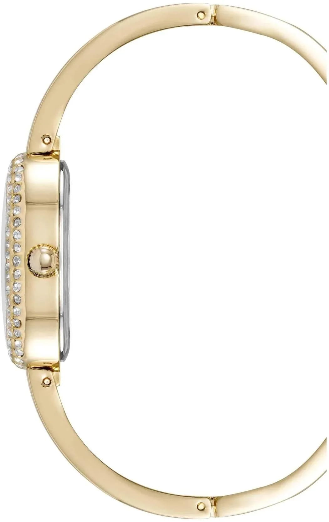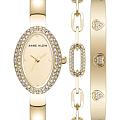 Женские кварцевые часы Anne Klein Box Set 5074GPST представляют собой элегантный аксессуар с овальным корпусом 20×30 мм из латуни с PVDPVDУльтратонкое покрытие наносится в технике вакуумного напыления, сочетает в себе нитрид титана особой прочности со слоем золота или оксида хрома. Несёт в себе декоративную или защитную функцию.-покрытием в золотистом оттенке и обрамленный бриллиантами. Модель оснащена кварцевым механизмом японского производства с точностью хода ±20 секунд в месяц и аналоговой индикацией времени. Циферблат бежевого цвета с позолоченными стрелками защищен минеральным стекломМинеральное стеклоМинеральное стекло представляет собой искусственно выращенный минерал кварца. Такое стекло отличается особой устойчивостью к повреждениям и царапинам. Уступает по некоторым качествам сапфировому стеклу., устойчивым к царапинам. Водонепроницаемость 30 метров (3 атм) обеспечивает защиту от брызг и дождя. Металлический браслет из нержавеющей стали шириной 20 мм и так же обрамленный бриллиантами, гармонично сочетается с корпусом, создавая целостный образ. Часы толщиной 6 мм отличаются утонченным профилем и комфортной посадкой на запястье. Прилагается два дополнительных браслета.