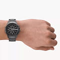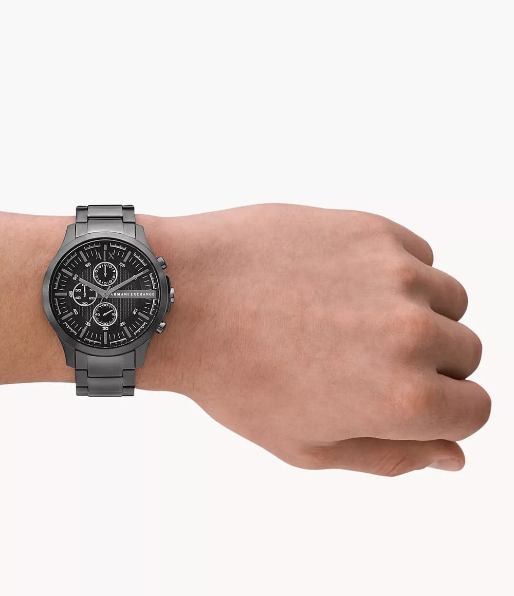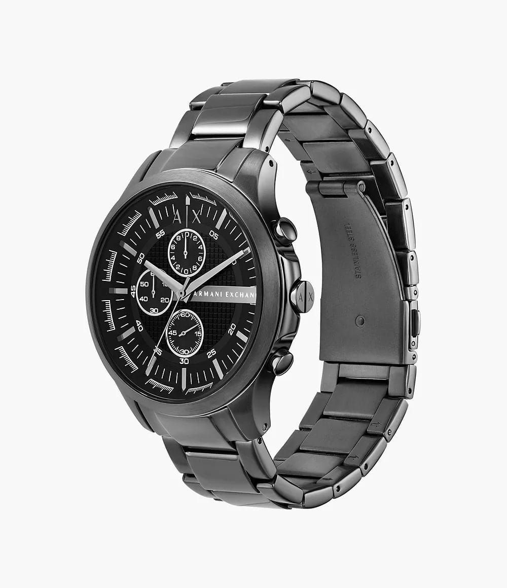 Мужские наручные часы-хронографХронографФункция позволяет измерять отрезки времени с особой точностью: часы, минуты, секунды. Верным признаком хронографа является наличие на циферблате 3 дополнительных окошек-счётчиков. с минеральным стекломМинеральное стеклоМинеральное стекло представляет собой искусственно выращенный минерал кварца. Такое стекло отличается особой устойчивостью к повреждениям и царапинам. Уступает по некоторым качествам сапфировому стеклу. Armani Exchange Hampton AX2454, кварцевый механизм с высокой точностью. Класс водозащиты: 50 метров, позволит защитить корпус от случайных брызг или капель дождя. Корпус часов изготовлен из нержавеющей стали с PVD-покрытиемPVDУльтратонкое покрытие наносится в технике вакуумного напыления, сочетает в себе нитрид титана особой прочности со слоем золота или оксида хрома. Несёт в себе декоративную или защитную функцию.. Стальной браслет с PVD-покрытиемPVDУльтратонкое покрытие наносится в технике вакуумного напыления, сочетает в себе нитрид титана особой прочности со слоем золота или оксида хрома. Несёт в себе декоративную или защитную функцию. с раскладной застёжкойРаскладная застёжкаТакой тип застёжки используется только на браслетах из металла. Она никогда не раскрывается полностью, происходит разделение на 2 и более частей. Раскладывающая застёжка снизит вероятность потери часов к минимуму.. Метки в виде штрихов.