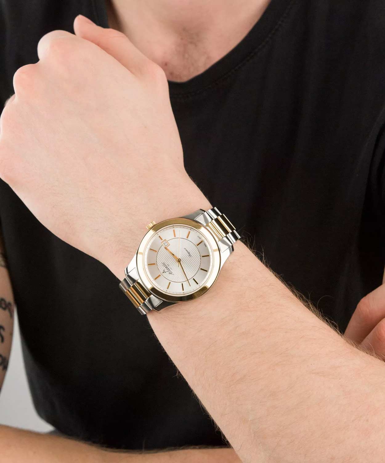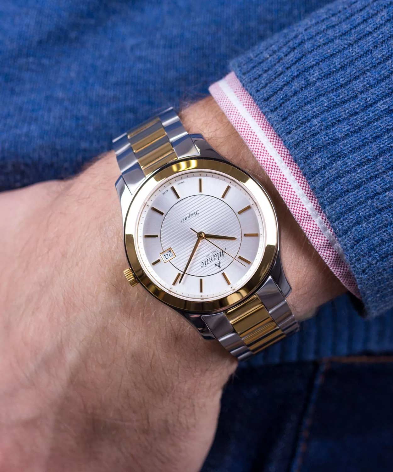 Мужские кварцевые швейцарские часы Atlantic Seapair 60335.43.21G, механизм с высокой точностью. Циферблат часов с сапфировым стекломСапфировое стеклоПрочный и надёжный материал из кристалла сапфира синтетического происхождения, характеризующийся особой твёрдостью и устойчивостью к царапинам и повреждениям., устойчивым к появлению царапин и обладающее высокой прозрачностью. Класс водозащиты: 30 метров, позволит защитить корпус от случайных брызг или капель дождя. Корпус часов изготовлен из нержавеющей стали. Стальной браслет с PVD-покрытиемPVDУльтратонкое покрытие наносится в технике вакуумного напыления, сочетает в себе нитрид титана особой прочности со слоем золота или оксида хрома. Несёт в себе декоративную или защитную функцию. на раскладной застёжкеРаскладная застёжкаТакой тип застёжки используется только на браслетах из металла. Она никогда не раскрывается полностью, происходит разделение на 2 и более частей. Раскладывающая застёжка снизит вероятность потери часов к минимуму.. Окошко даты находится в положении 3 часа. БезельБезельВнешний ободок, закрепляющий стекло. В спортивных часах так называется поворотное кольцо с делениями на циферблате, выполняет роль таймера – замеряет отрезки времени на шкале. Неподвижный безель – элемент декора. Однонаправленно вращающийся безель на дайверских часах позволяет фиксировать моменты погружения и выныривания на поверхность. с PVD-покрытиемPVDУльтратонкое покрытие наносится в технике вакуумного напыления, сочетает в себе нитрид титана особой прочности со слоем золота или оксида хрома. Несёт в себе декоративную или защитную функцию..