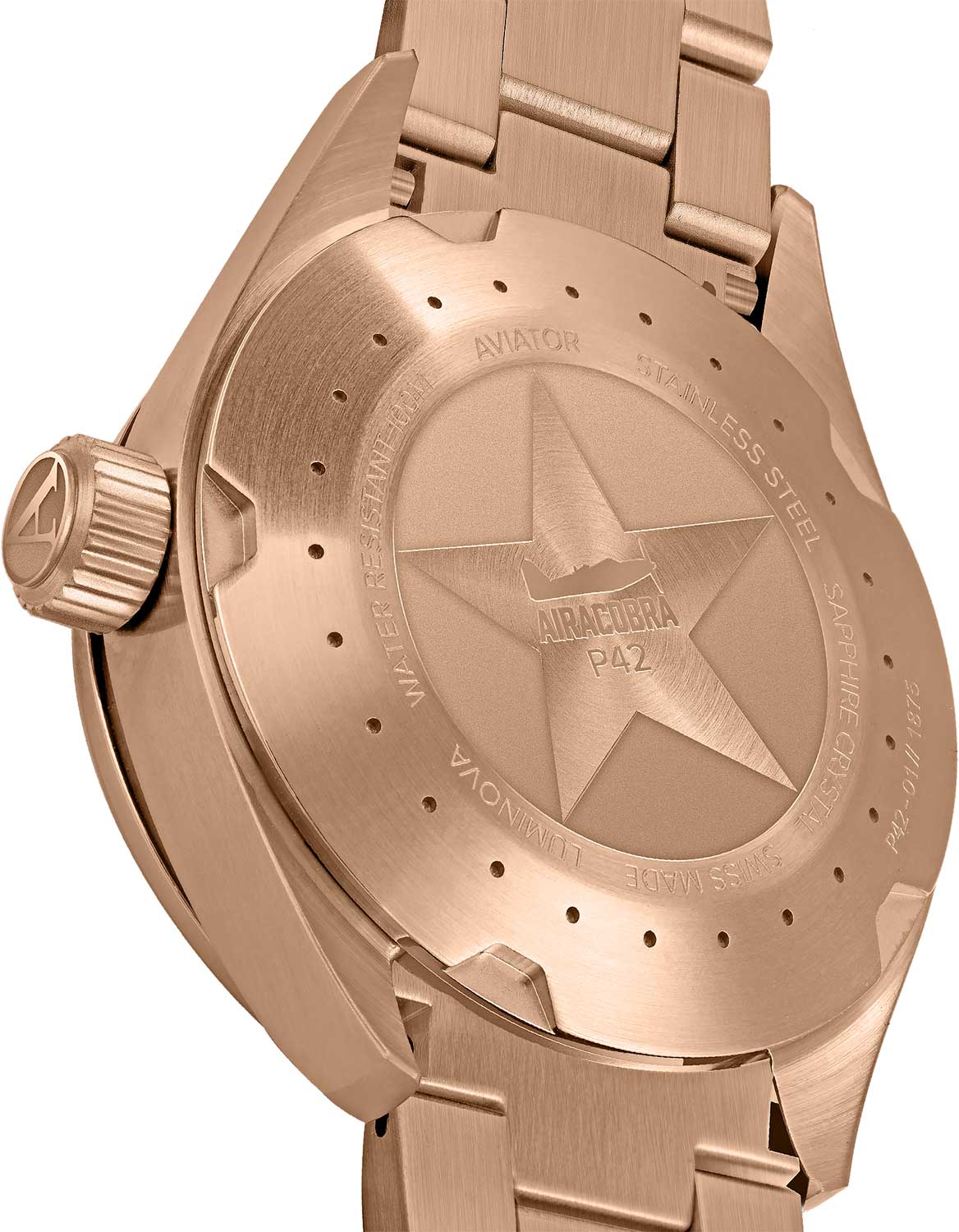 Aviator Airacobra V.1.22.2.152.5 — швейцарские часы в классике авиадизайна, сочетающие безупречную читаемость и высокую надёжность. Корпус диаметром 42 мм выполнен из нержавеющей стали с PVD-покрытиемPVDУльтратонкое покрытие наносится в технике вакуумного напыления, сочетает в себе нитрид титана особой прочности со слоем золота или оксида хрома. Несёт в себе декоративную или защитную функцию. — это придаёт модели благородный и уверенный облик.