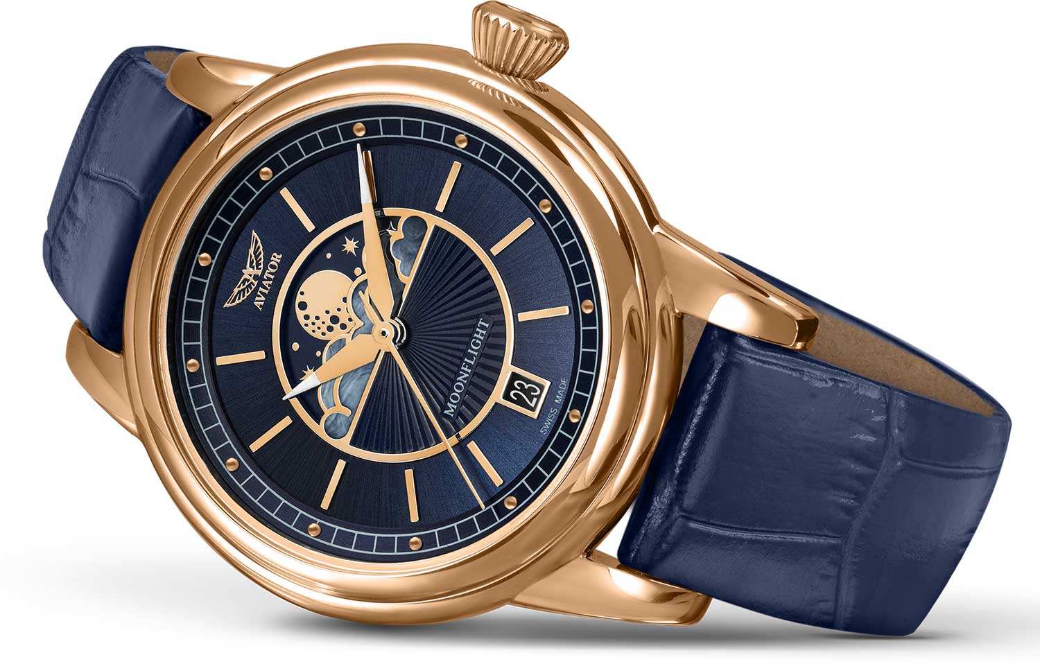 Aviator V.1.33.2.256.4 “Douglas Moonflight” — элегантный дамский швейцарский Moonphase с утончённой авиационной эстетикой. Корпус 36 мм из нержавеющей стали с PVD-покрытиемPVDУльтратонкое покрытие наносится в технике вакуумного напыления, сочетает в себе нитрид титана особой прочности со слоем золота или оксида хрома. Несёт в себе декоративную или защитную функцию. с полированной отделкой обладает компактными пропорциями и удобным литым профилем.