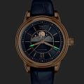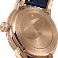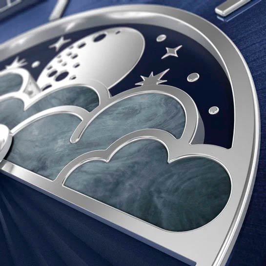 Циферблат в стиле Art Deco украшает усложнение фаз Луны в верхней половине, обрамлённой тонким кольцом облаков. Отмечено окно даты в положении «6 часов». Стрелки и накладные метки обработаны люминесцентным покрытиемЛюминесцентное покрытиеПозволяет считывать показания времени в темноте. Производители наносят на стрелки, часовые индексы, безель или поверхность циферблата светонакопительный состав, дающий холодное свечение. Superluminova — для уверенного считывания в темноте. Поверхность защищена сапфировым стекломСапфировое стеклоПрочный и надёжный материал из кристалла сапфира синтетического происхождения, характеризующийся особой твёрдостью и устойчивостью к царапинам и повреждениям. с антибликовым покрытием.