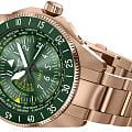 Циферблат отличается детальной функциональностью: в центре — крупные арабские цифры и стрелки, покрытые люминесцентным покрытиемЛюминесцентное покрытиеПозволяет считывать показания времени в темноте. Производители наносят на стрелки, часовые индексы, безель или поверхность циферблата светонакопительный состав, дающий холодное свечение., обеспечивающими мгновенное считывание времени даже в темноте. На «3 часах» — окошко даты, а индикатор второго часового пояса (GMT) удобно расположен на «9 часах». С внешней стороны — вращающийся безельБезельВнешний ободок, закрепляющий стекло. В спортивных часах так называется поворотное кольцо с делениями на циферблате, выполняет роль таймера – замеряет отрезки времени на шкале. Неподвижный безель – элемент декора. Однонаправленно вращающийся безель на дайверских часах позволяет фиксировать моменты погружения и выныривания на поверхность. с PVD-покрытиемPVDУльтратонкое покрытие наносится в технике вакуумного напыления, сочетает в себе нитрид титана особой прочности со слоем золота или оксида хрома. Несёт в себе декоративную или защитную функцию. с насечкой и градусной шкалой для секунд — идеален для расчёта времени пути или времени прибытия .