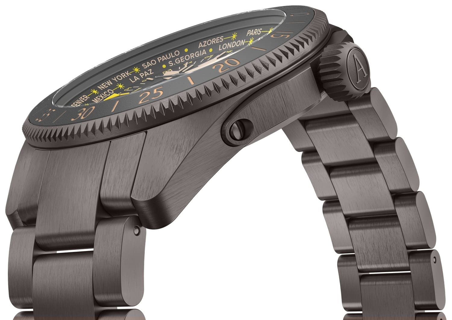 Циферблат отличается детальной функциональностью: в центре — крупные арабские цифры и стрелки, покрытые люминесцентным покрытиемЛюминесцентное покрытиеПозволяет считывать показания времени в темноте. Производители наносят на стрелки, часовые индексы, безель или поверхность циферблата светонакопительный состав, дающий холодное свечение., обеспечивающими мгновенное считывание времени даже в темноте. На «3 часах» — окошко даты, а индикатор второго часового пояса (GMT) удобно расположен на «9 часах». С внешней стороны — вращающийся безельБезельВнешний ободок, закрепляющий стекло. В спортивных часах так называется поворотное кольцо с делениями на циферблате, выполняет роль таймера – замеряет отрезки времени на шкале. Неподвижный безель – элемент декора. Однонаправленно вращающийся безель на дайверских часах позволяет фиксировать моменты погружения и выныривания на поверхность. с PVD-покрытиемPVDУльтратонкое покрытие наносится в технике вакуумного напыления, сочетает в себе нитрид титана особой прочности со слоем золота или оксида хрома. Несёт в себе декоративную или защитную функцию. с насечкой и градусной шкалой для секунд — идеален для расчёта времени пути или времени прибытия .