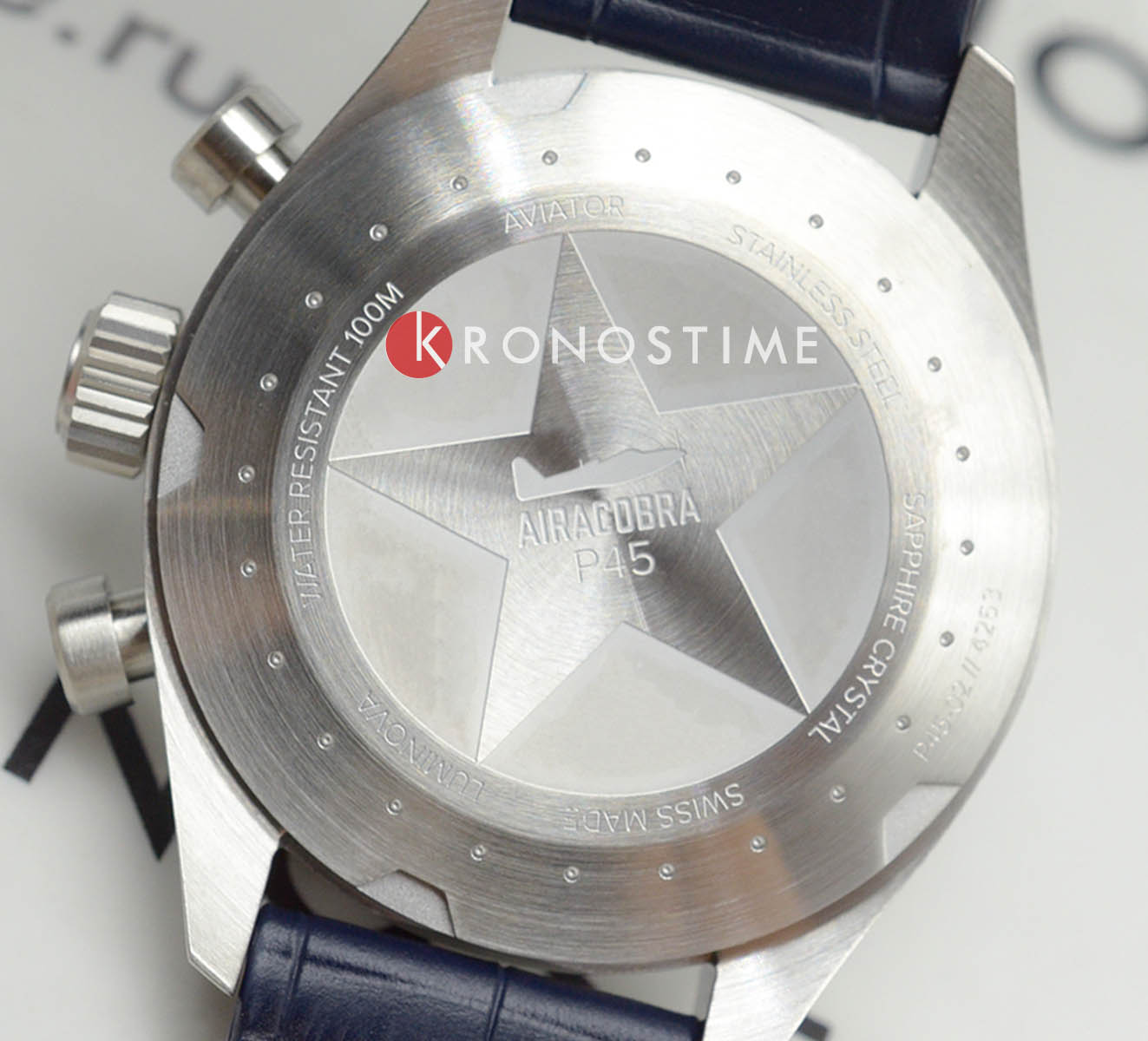 Aviator Airacobra V.2.25.0.170.4 — швейцарский GMT-хронограф в духе пилотских инструментов, объединяющий точность, удобство и лаконичный дизайн. Диаметр корпуса — 45 мм, выполнен из нержавеющей стали, что подчёркивает техническую надёжность в образе часов.