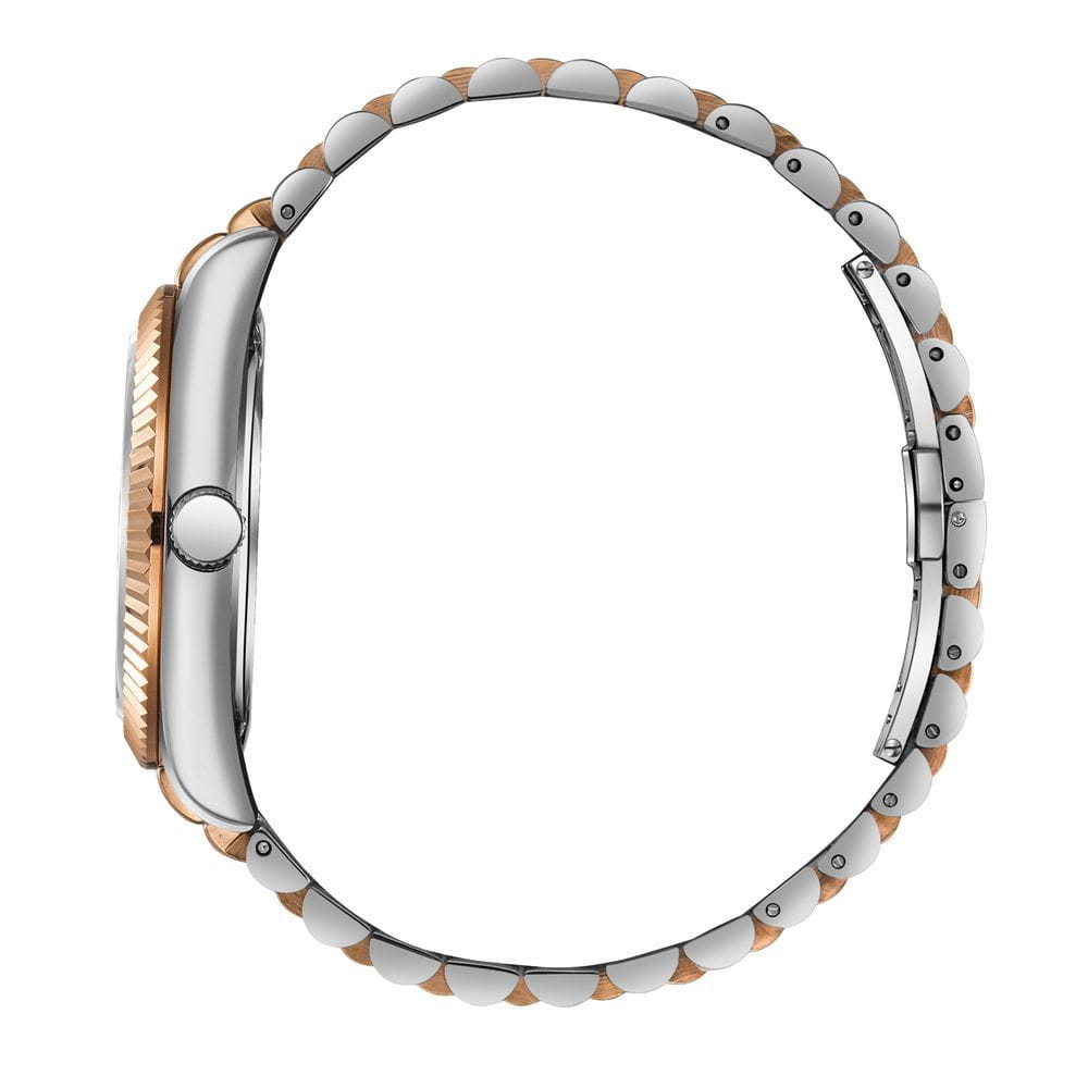 Завершает образ стальной браслет с PVD-покрытиемPVDУльтратонкое покрытие наносится в технике вакуумного напыления, сочетает в себе нитрид титана особой прочности со слоем золота или оксида хрома. Несёт в себе декоративную или защитную функцию. и раскладывающейся застежкой-бабочкойЗастёжка "бабочка"Такой вид застёжки дополняется предохранителями, помогающими избежать случайного раскрытия браслета. Обладают изящным исполнением. , обеспечивающей комфорт и уверенную фиксацию на запястье. Такая застежка выглядит стильно и практично.