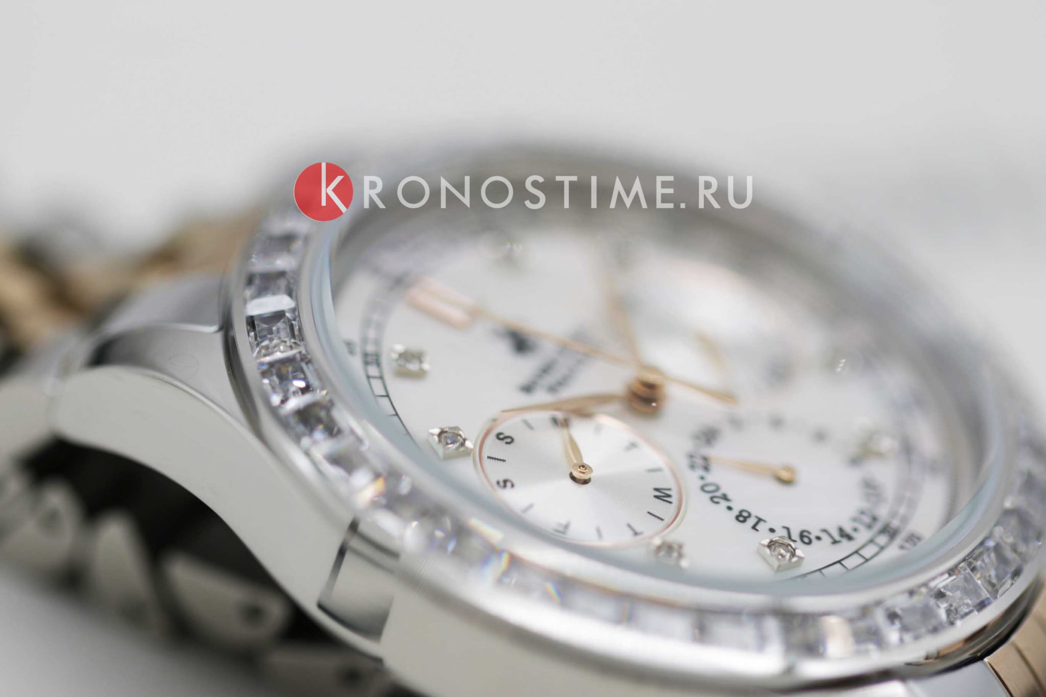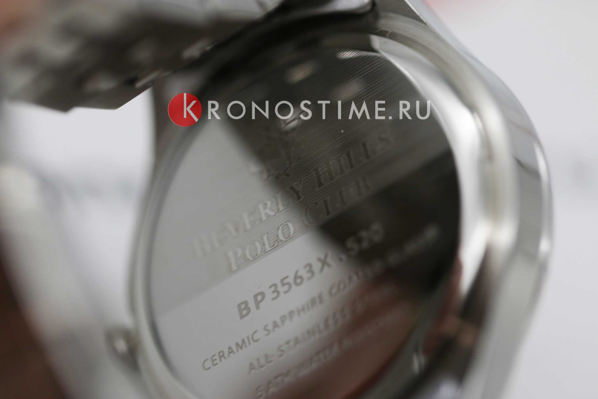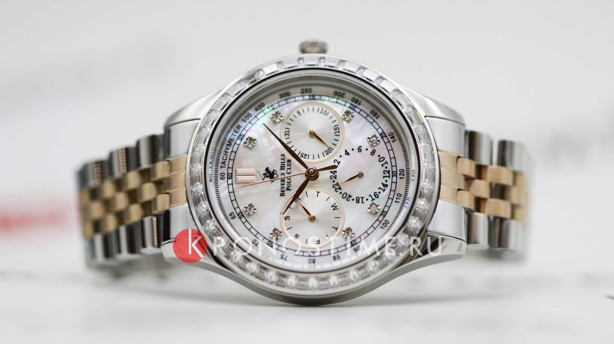 Американские женские часы с минеральным стекломМинеральное стеклоМинеральное стекло представляет собой искусственно выращенный минерал кварца. Такое стекло отличается особой устойчивостью к повреждениям и царапинам. Уступает по некоторым качествам сапфировому стеклу. Beverly Hills Polo Club BP3563X.520, кварцевый механизм с высокой точностью. Корпус часов изготовлен из нержавеющей стали. На циферблате расположены три дополнительных индикатора (24-х часовой формат времени, день недели и дата) и шкала тахиметрТахиметрРазмеченная шкала, располагается на ободке или безеле часов. Тахиметр позволяет рассчитать скорость на определённом участке пути, расстояние измеряется в километрах или милях.. Класс водозащиты: 50 метров, позволит защитить корпус от случайных брызг или капель дождя. Стальной браслет с частичным IP-покрытиемIP-покрытиеМетод ионного напыления. Демонстрирует повышенную устойчивость к истиранию, окислению и химическим веществам. Под воздействием высокого давления и температуры около 1500°C молекулы металла надёжно соединяются с частицами корпуса часов. на застёжке бабочке. БезельБезельВнешний ободок, закрепляющий стекло. В спортивных часах так называется поворотное кольцо с делениями на циферблате, выполняет роль таймера – замеряет отрезки времени на шкале. Неподвижный безель – элемент декора. Однонаправленно вращающийся безель на дайверских часах позволяет фиксировать моменты погружения и выныривания на поверхность. и циферблат инкрустирован кристаллами.