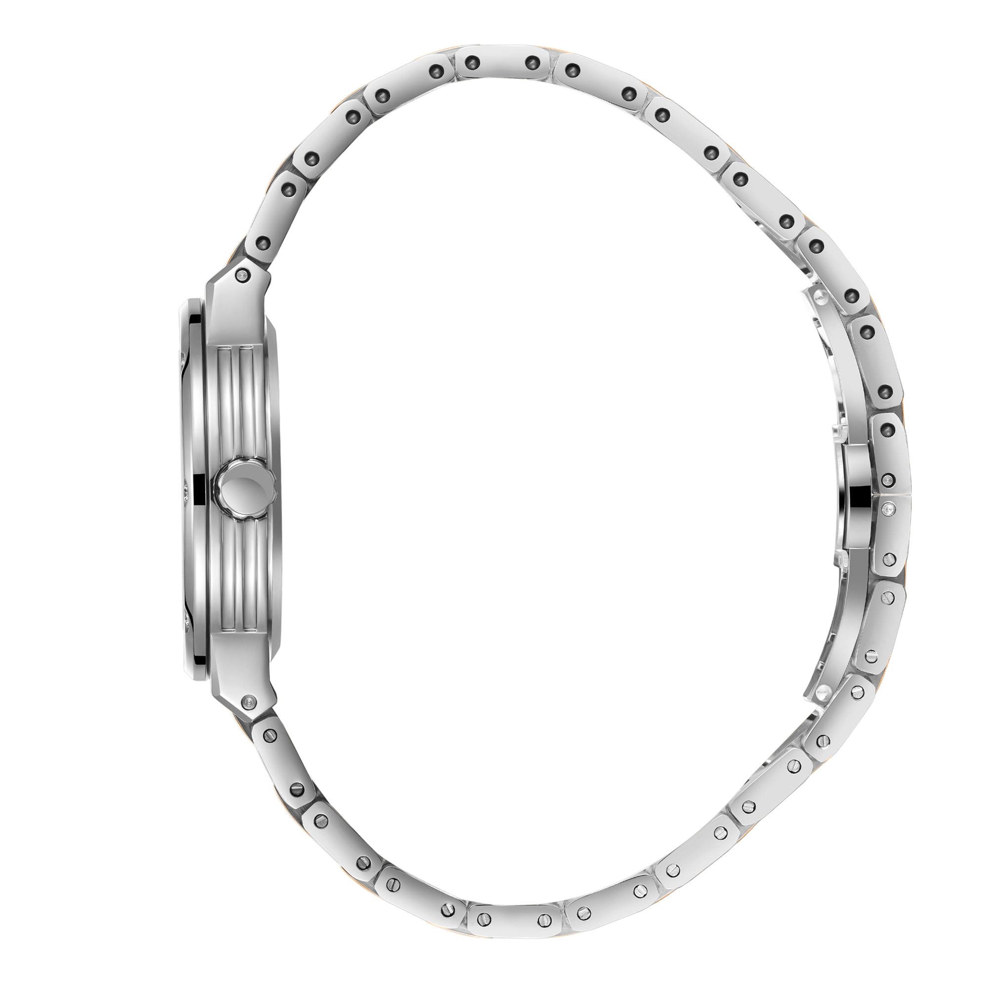 Уровень водозащиты 50 метров (5 ATM) позволяет носить часы во время повседневных водных процедур, таких как умывание или приём душа, однако стоит избегать их использования при плавании. Браслет из нержавеющей стали с удобной раскладной застёжкой дарит комфорт и уверенность в том, что часы будут надёжно закреплены на вашем запястье. Циркониевые вставки добавляют часам блеска и изысканности, превращая их в настоящее украшение. Стальной браслет с частичным IP-покрытиемIP-покрытиеМетод ионного напыления. Демонстрирует повышенную устойчивость к истиранию, окислению и химическим веществам. Под воздействием высокого давления и температуры около 1500°C молекулы металла надёжно соединяются с частицами корпуса часов. на раскладной застёжкеРаскладная застёжкаТакой тип застёжки используется только на браслетах из металла. Она никогда не раскрывается полностью, происходит разделение на 2 и более частей. Раскладывающая застёжка снизит вероятность потери часов к минимуму..