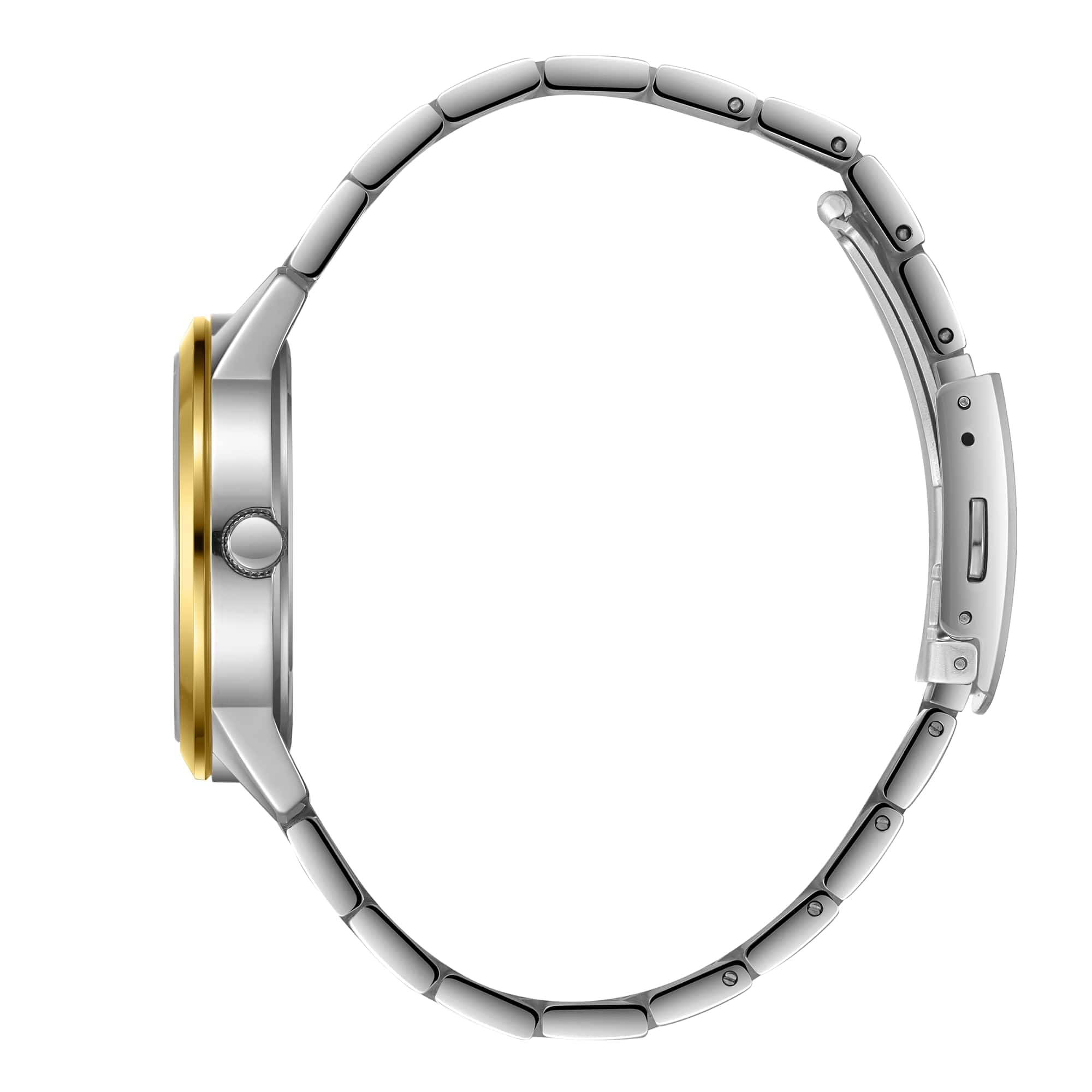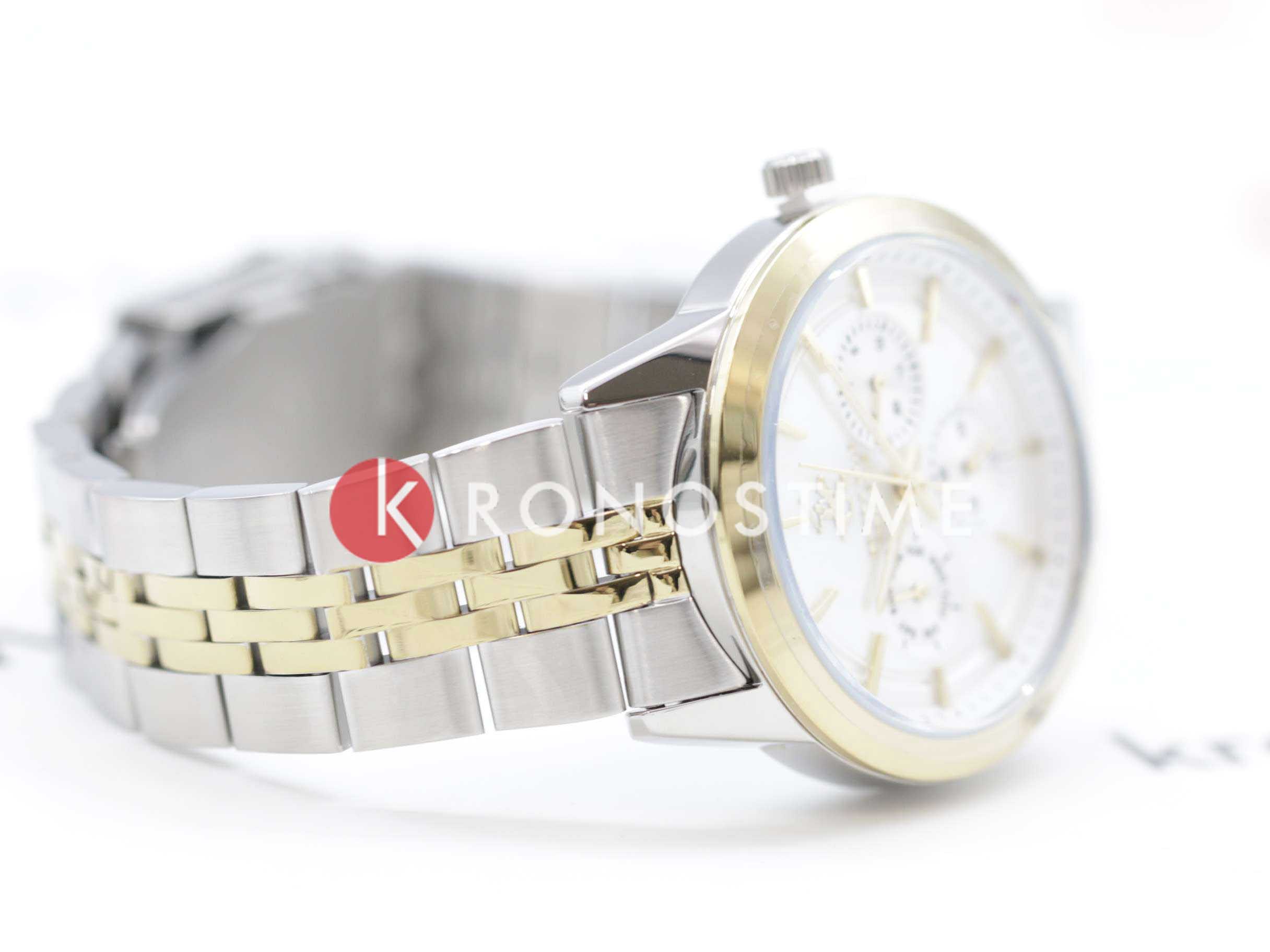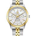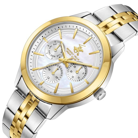 Beverly Hills Polo Club BP3705C.220 – элегантные женские часы, сочетающие стильный дизайн и высокую функциональность. Корпус диаметром 36 мм выполнен из суперметалла, обеспечивающего прочность и долговечность. Циферблат украшен, и защищён минеральным стекломМинеральное стеклоМинеральное стекло представляет собой искусственно выращенный минерал кварца. Такое стекло отличается особой устойчивостью к повреждениям и царапинам. Уступает по некоторым качествам сапфировому стеклу., устойчивым к царапинам. БезельБезельВнешний ободок, закрепляющий стекло. В спортивных часах так называется поворотное кольцо с делениями на циферблате, выполняет роль таймера – замеряет отрезки времени на шкале. Неподвижный безель – элемент декора. Однонаправленно вращающийся безель на дайверских часах позволяет фиксировать моменты погружения и выныривания на поверхность. с PVD-покрытиемPVDУльтратонкое покрытие наносится в технике вакуумного напыления, сочетает в себе нитрид титана особой прочности со слоем золота или оксида хрома. Несёт в себе декоративную или защитную функцию.. Часы оснащены точным кварцевым механизмом, гарантирующим надёжное отображение времени. Браслет из нержавеющей стали с PVD-покрытиемPVDУльтратонкое покрытие наносится в технике вакуумного напыления, сочетает в себе нитрид титана особой прочности со слоем золота или оксида хрома. Несёт в себе декоративную или защитную функцию. на раскладной застёжкеРаскладная застёжкаТакой тип застёжки используется только на браслетах из металла. Она никогда не раскрывается полностью, происходит разделение на 2 и более частей. Раскладывающая застёжка снизит вероятность потери часов к минимуму., обеспечивающей комфортное ношение и надёжную фиксацию на запястье. Водозащита до 50 метров (5 ATM) позволяет использовать часы в повседневной жизни, включая кратковременное погружение в воду.