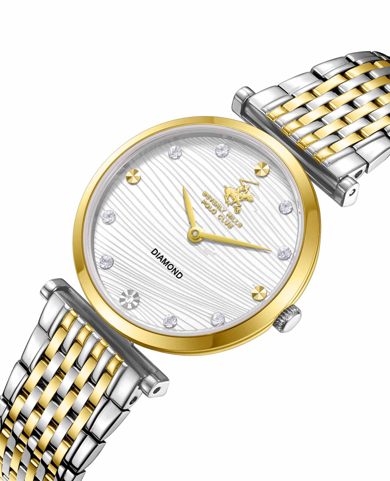 Женские наручные часы Beverly Hills Polo Club BP3737X.230 сочетают в себе элегантный дизайн и надежность современных технологий. Модель обладает круглым корпусом, изготовленным из нержавеющей стали, что обеспечивает долговечность и устойчивость к внешним воздействиям. Для защиты циферблата используется минеральное стеклоМинеральное стеклоМинеральное стекло представляет собой искусственно выращенный минерал кварца. Такое стекло отличается особой устойчивостью к повреждениям и царапинам. Уступает по некоторым качествам сапфировому стеклу., которое эффективно противостоит царапинам. Часы оснащены кварцевым механизмом, гарантирующим точное время без необходимости подзаводки. Водонепроницаемость модели достигает 50 метров (WR 50), что позволяет использовать их при контакте с водой, например, во время мытья рук или дождя. Стальной браслет с частичным IP-покрытиемIP-покрытиеМетод ионного напыления. Демонстрирует повышенную устойчивость к истиранию, окислению и химическим веществам. Под воздействием высокого давления и температуры около 1500°C молекулы металла надёжно соединяются с частицами корпуса часов. на застёжке-бабочке с кнопкамиЗастёжка "бабочка"Такой вид застёжки дополняется предохранителями, помогающими избежать случайного раскрытия браслета. Обладают изящным исполнением. , обеспечивающей комфортное ношение и безопасность. БезельБезельВнешний ободок, закрепляющий стекло. В спортивных часах так называется поворотное кольцо с делениями на циферблате, выполняет роль таймера – замеряет отрезки времени на шкале. Неподвижный безель – элемент декора. Однонаправленно вращающийся безель на дайверских часах позволяет фиксировать моменты погружения и выныривания на поверхность. с IP-покрытиемIP-покрытиеМетод ионного напыления. Демонстрирует повышенную устойчивость к истиранию, окислению и химическим веществам. Под воздействием высокого давления и температуры около 1500°C молекулы металла надёжно соединяются с частицами корпуса часов..
