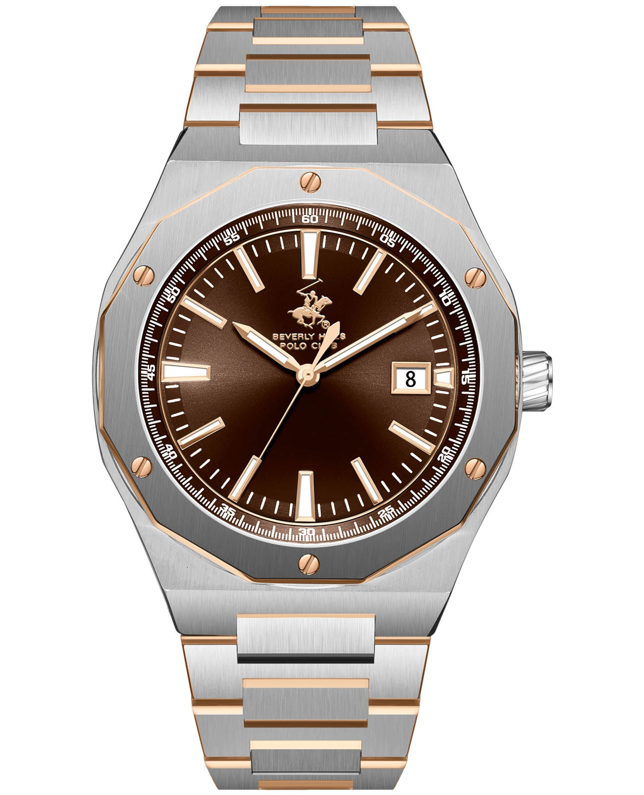 Американские мужские часы Beverly Hills Polo Club BP3788X.540 - это стильный мужской аксессуар, который сочетает элегантный дизайн и практичность. Корпус выполнен из нержавеющей стали серебристого цвета, диаметром 43 мм, что обеспечивает долговечность и утончённый внешний вид. Надежное минеральное стеклоМинеральное стеклоМинеральное стекло представляет собой искусственно выращенный минерал кварца. Такое стекло отличается особой устойчивостью к повреждениям и царапинам. Уступает по некоторым качествам сапфировому стеклу. с сапфировым покрытием защищает циферблат от царапин и обеспечивает долговечность. Неподвижный безельБезельВнешний ободок, закрепляющий стекло. В спортивных часах так называется поворотное кольцо с делениями на циферблате, выполняет роль таймера – замеряет отрезки времени на шкале. Неподвижный безель – элемент декора. Однонаправленно вращающийся безель на дайверских часах позволяет фиксировать моменты погружения и выныривания на поверхность. с частичным IP-покрытиемIP-покрытиеМетод ионного напыления. Демонстрирует повышенную устойчивость к истиранию, окислению и химическим веществам. Под воздействием высокого давления и температуры около 1500°C молекулы металла надёжно соединяются с частицами корпуса часов.. Модель оснащена кварцевым механизмом, обеспечивающим высокую точность хода. Стальной браслет на застёжке-бабочке с кнопкамиЗастёжка "бабочка"Такой вид застёжки дополняется предохранителями, помогающими избежать случайного раскрытия браслета. Обладают изящным исполнением. с частичным IP-покрытиемIP-покрытиеМетод ионного напыления. Демонстрирует повышенную устойчивость к истиранию, окислению и химическим веществам. Под воздействием высокого давления и температуры около 1500°C молекулы металла надёжно соединяются с частицами корпуса часов. цвета розового золота обеспечивает комфортное ношение. Окошко даты находится в положении 3 часа. Стрелки и метки с люминесцентным покрытиемЛюминесцентное покрытиеПозволяет считывать показания времени в темноте. Производители наносят на стрелки, часовые индексы, безель или поверхность циферблата светонакопительный состав, дающий холодное свечение. позволяют легко считывать время даже в условиях недостаточного освещения. Водозащита 50 метров позволит защитить корпус от случайных брызг или капель дождя. Эта модель – отличный выбор для тех, кто ищет сочетание стиля, качества и функциональности. Часы станут не только полезным аксессуаром, но и выразительным элементом вашего имиджа.
