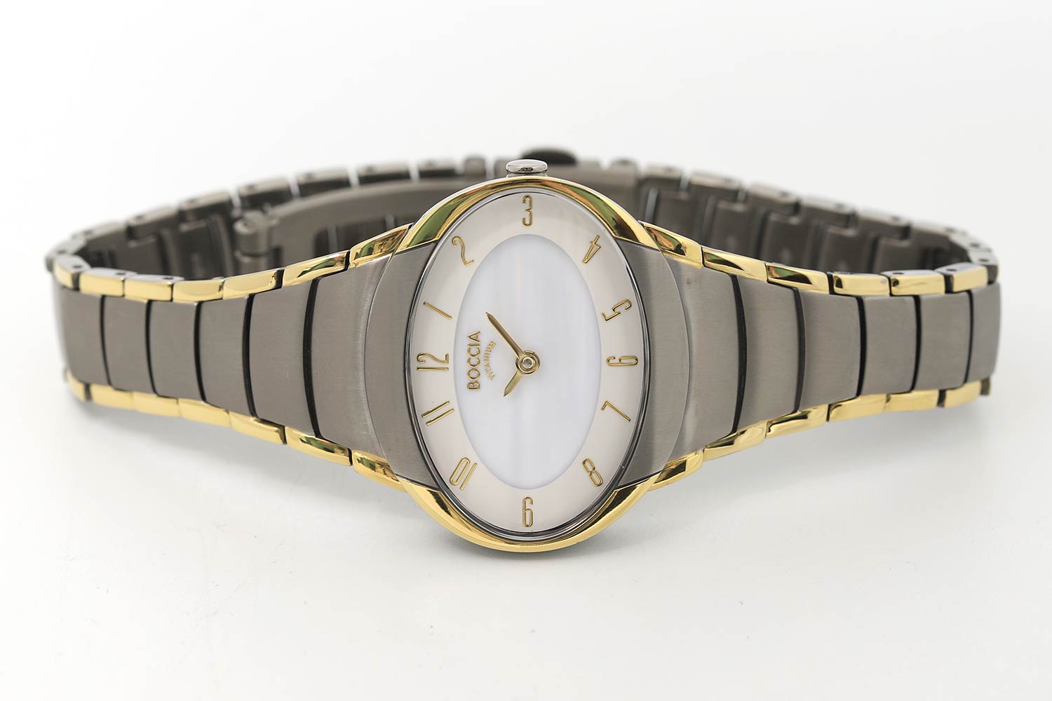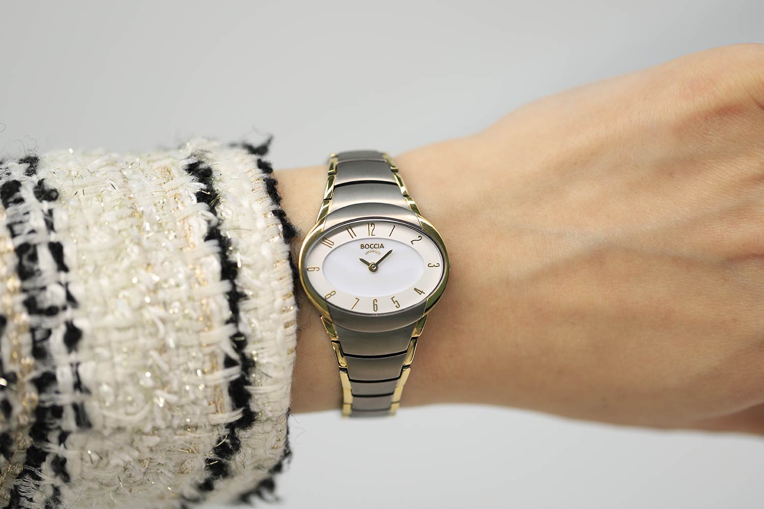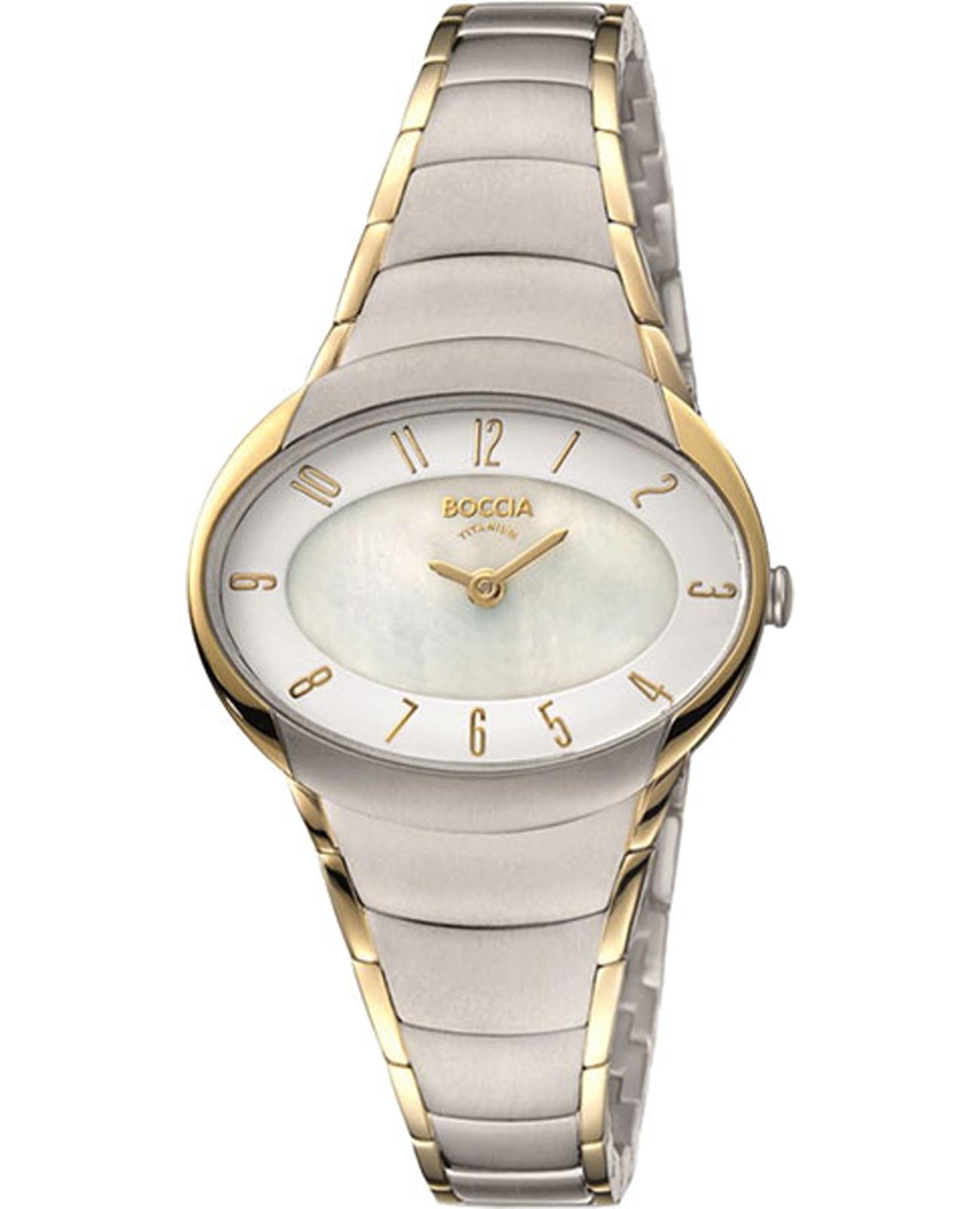 Женские наручные часы Boccia Titanium 3255-04 с надёжным кварцевым механизмом. Корпус и браслет часов изготовлены из титана с частичным PVD-покрытиемPVDУльтратонкое покрытие наносится в технике вакуумного напыления, сочетает в себе нитрид титана особой прочности со слоем золота или оксида хрома. Несёт в себе декоративную или защитную функцию.. Минеральное стеклоМинеральное стеклоМинеральное стекло представляет собой искусственно выращенный минерал кварца. Такое стекло отличается особой устойчивостью к повреждениям и царапинам. Уступает по некоторым качествам сапфировому стеклу. устойчивое к мелким механическим повреждениям. Титановый браслет на раскладной застёжкеРаскладная застёжкаТакой тип застёжки используется только на браслетах из металла. Она никогда не раскрывается полностью, происходит разделение на 2 и более частей. Раскладывающая застёжка снизит вероятность потери часов к минимуму.. Класс водозащиты: 50 метров, позволит защитить корпус от случайных брызг или капель дождя.