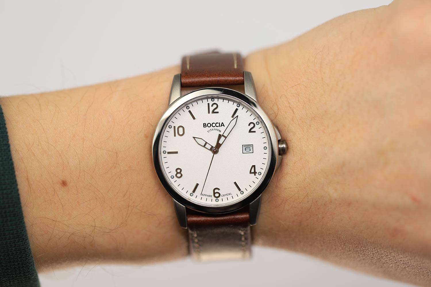 Мужские немецкие титановые часы Boccia Titanium Circle-Oval 3625-01 - это воплощение элегантности и минимализма. Легкий и прочный титановый корпус обеспечивает комфорт при ношении, а лаконичный дизайн циферблата диаметром 37 мм со стрелками подчеркивает изысканный вкус. Сапфировое стеклоСапфировое стеклоПрочный и надёжный материал из кристалла сапфира синтетического происхождения, характеризующийся особой твёрдостью и устойчивостью к царапинам и повреждениям. надежно защищает циферблат от царапин, сохраняя безупречный внешний вид часов на долгие годы. Комфортное ношение обеспечивается благодаря высококачественному ремню из кожи, который дополнен стандартной застежкой для удобства использования. Класс водозащиты: 50 метров, позволит защитить корпус от случайных брызг или капель дождя. Стрелки с люминесцентным покрытиемЛюминесцентное покрытиеПозволяет считывать показания времени в темноте. Производители наносят на стрелки, часовые индексы, безель или поверхность циферблата светонакопительный состав, дающий холодное свечение., позволяющие легко определять время даже в темноте. Окошко даты находится в положении 3 часов.