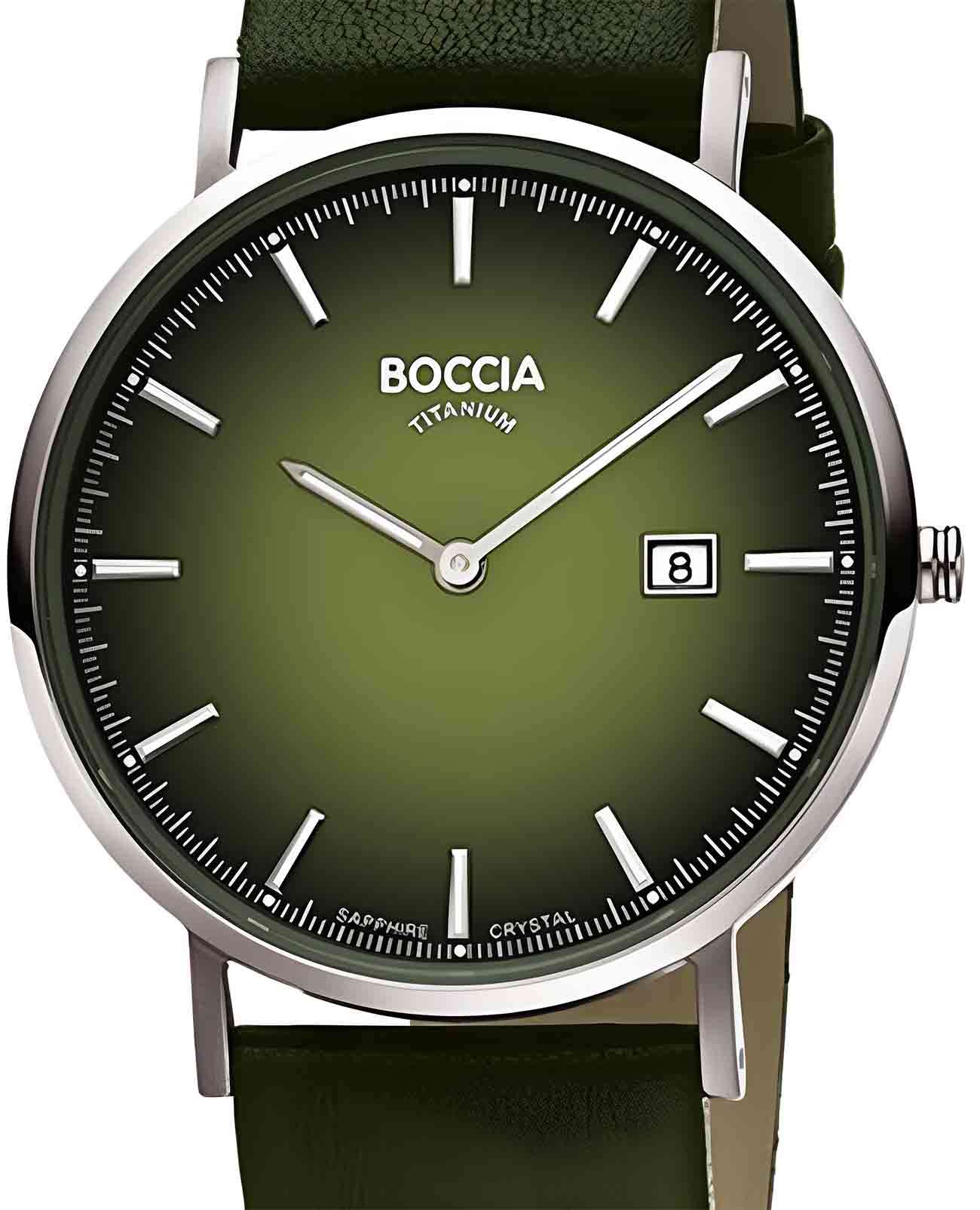Мужские часы Boccia 3648-03 – это сочетание изысканного дизайна и высокой функциональности, созданное для современных мужчин, ценящих надежность и стиль. Оснащенные кварцевым механизмом Miyota GM15, эти часы обеспечивают точное измерение времени. На зеленом циферблате четко видны центральные часовая и минутная стрелки, а также апертура даты, расположенная в позиции 3 часов, что добавляет удобства в повседневном использовании. Корпус часов выполнен из гипоаллергенного титана, что обеспечивает легкость и комфорт при ношении, а диаметр корпуса составляет 39 мм, что делает их универсальными и подходящими для любого запястья. Стрелки и метки покрыты люминесцентным покрытиемЛюминесцентное покрытиеПозволяет считывать показания времени в темноте. Производители наносят на стрелки, часовые индексы, безель или поверхность циферблата светонакопительный состав, дающий холодное свечение., которое мягко светится в темноте, освещая путь даже в самых загадочных сумерках. Зеленый кожаный ремешок с стандартной застежкой гармонично дополняет общий стиль, придавая часам уникальный характер. Сапфировое стеклоСапфировое стеклоПрочный и надёжный материал из кристалла сапфира синтетического происхождения, характеризующийся особой твёрдостью и устойчивостью к царапинам и повреждениям., устойчивое к царапинам, надежно защищает циферблат, сохраняя его безупречный вид. Водостойкость уровня WR 50 позволяет не беспокоиться о часах при мытье рук или попадании под дождь.