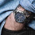 Мужские немецкие титановые часы-хронографХронографФункция позволяет измерять отрезки времени с особой точностью: часы, минуты, секунды. Верным признаком хронографа является наличие на циферблате 3 дополнительных окошек-счётчиков. с секундомеромСекундомерСекундоме́р — прибор, способный измерять интервалы времени с точностью до долей секунды. Boccia Titanium Circle-Oval 3751-01, кварцевый механизм с высокой точностью. Минеральное стеклоМинеральное стеклоМинеральное стекло представляет собой искусственно выращенный минерал кварца. Такое стекло отличается особой устойчивостью к повреждениям и царапинам. Уступает по некоторым качествам сапфировому стеклу. устойчивое к появлению царапин, обладающее высокой прозрачностью. Корпус изготовлен из титана. БезельБезельВнешний ободок, закрепляющий стекло. В спортивных часах так называется поворотное кольцо с делениями на циферблате, выполняет роль таймера – замеряет отрезки времени на шкале. Неподвижный безель – элемент декора. Однонаправленно вращающийся безель на дайверских часах позволяет фиксировать моменты погружения и выныривания на поверхность. из титана со шкалой тахиметрТахиметрРазмеченная шкала, располагается на ободке или безеле часов. Тахиметр позволяет рассчитать скорость на определённом участке пути, расстояние измеряется в километрах или милях.. На цифрблате расположены три дополнительных индикатора и окошко даты. Стрелки с люминесцентным покрытиемЛюминесцентное покрытиеПозволяет считывать показания времени в темноте. Производители наносят на стрелки, часовые индексы, безель или поверхность циферблата светонакопительный состав, дающий холодное свечение.. Класс водозащиты: 100 метров, позволит плавать, нырять и заниматься другими водными видами спорта. Браслет из титана на раскладной застёжкеРаскладная застёжкаТакой тип застёжки используется только на браслетах из металла. Она никогда не раскрывается полностью, происходит разделение на 2 и более частей. Раскладывающая застёжка снизит вероятность потери часов к минимуму..
