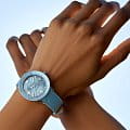 Класс водозащиты: 100 метров, позволит плавать, нырять и заниматься другими водными видами спорта. Корпус часов изготовлен из нержавеющей стали, серебристого цвета. Ремешок из телячьей кожи цвета морской волны со складной клипсой из нержавеющей стали.