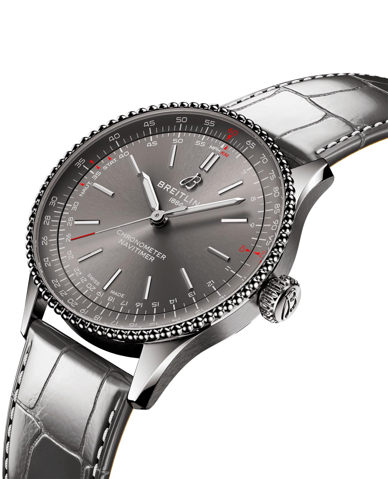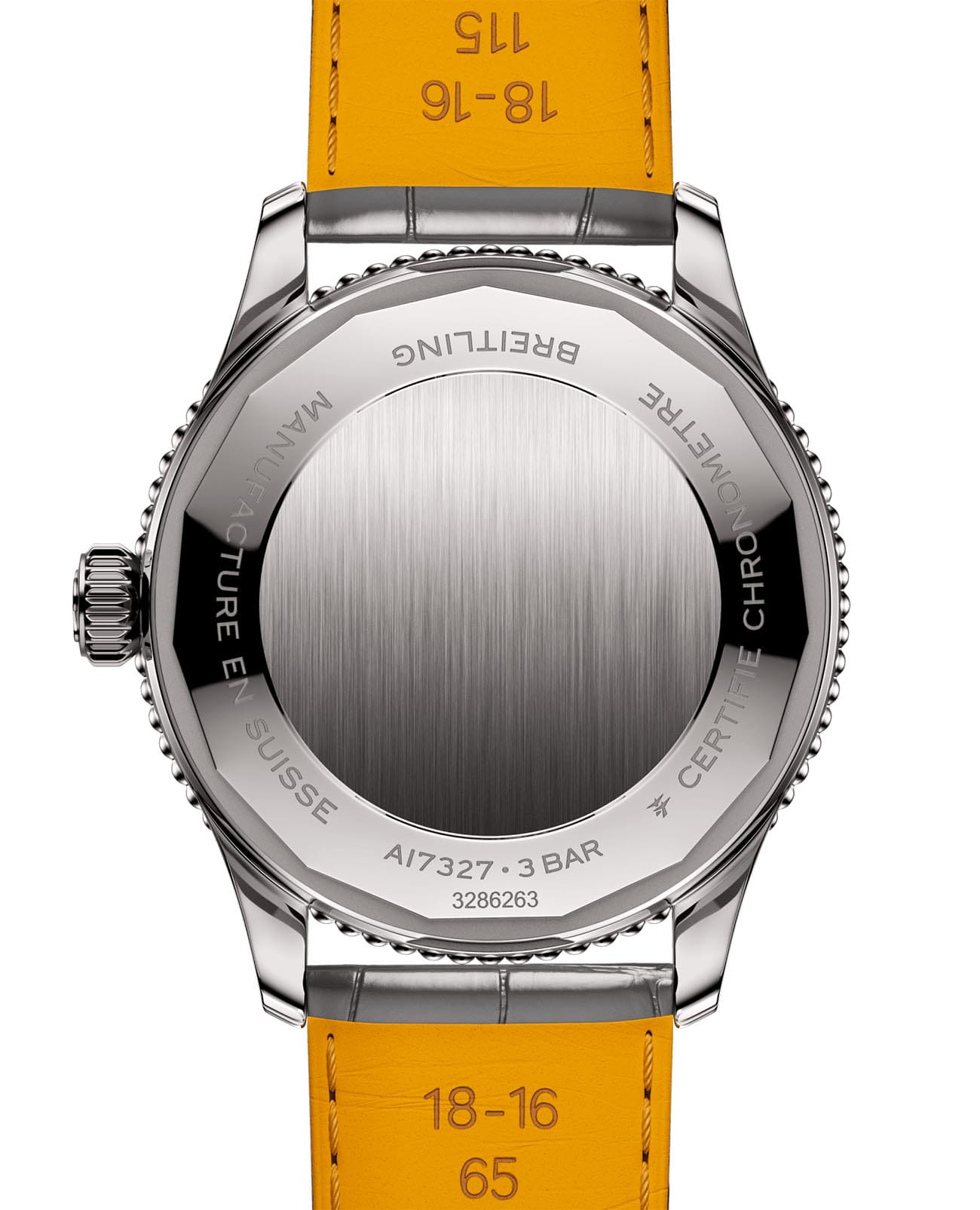 Швейцарские унисекс часы-хронометр Breitling Navitimer Automatic 36 A17327381B1P1, механический механизм (автоматический калибр) с высокой точностью. Сапфировое стеклоСапфировое стеклоПрочный и надёжный материал из кристалла сапфира синтетического происхождения, характеризующийся особой твёрдостью и устойчивостью к царапинам и повреждениям. устойчивое к появлению царапин, обладающее высокой прозрачностью. Класс водозащиты: 30 метров, позволит защитить корпус от случайных брызг или капель дождя. Корпус часов изготовлен из нержавеющей стали. Ремешок из кожи аллигатора с раскладной застёжкойРаскладная застёжкаТакой тип застёжки используется только на браслетах из металла. Она никогда не раскрывается полностью, происходит разделение на 2 и более частей. Раскладывающая застёжка снизит вероятность потери часов к минимуму.. Часы оснащены логарифмической линейкой. Стрелки с люминесцентным покрытиемЛюминесцентное покрытиеПозволяет считывать показания времени в темноте. Производители наносят на стрелки, часовые индексы, безель или поверхность циферблата светонакопительный состав, дающий холодное свечение..