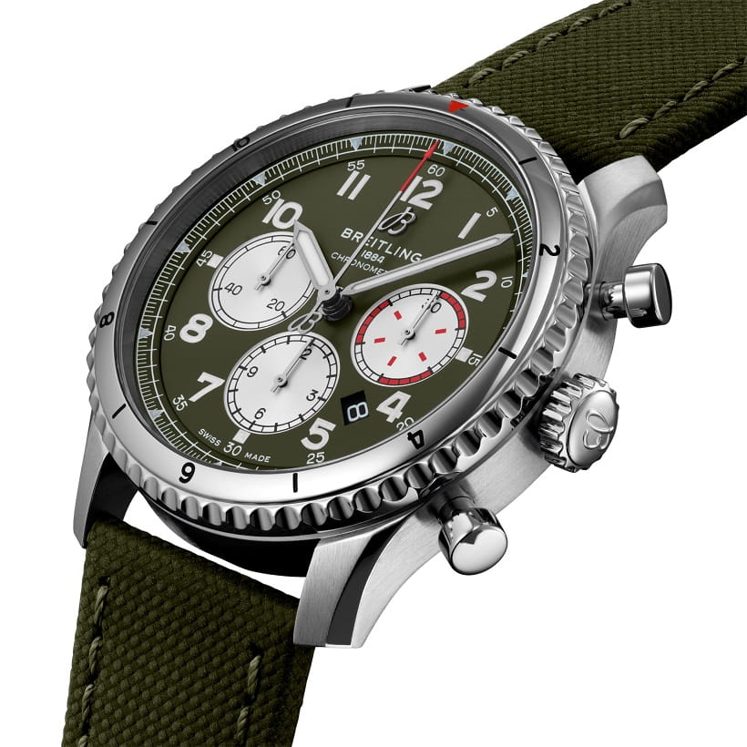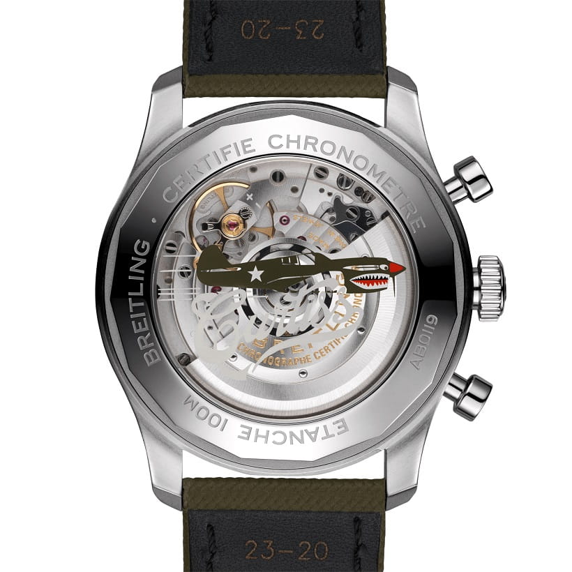 Часы Aviator 8 B01 Chronograph 43 Curtiss Warhawk AB01192A1L1X2 всегда готовы к работе в самых жестких условиях. Окошко отображения даты находится в положении «4:30». Внутри корпуса располагается мануфактурный механизм Breitling Manufacture Caliber 01: он сертифицирован Швейцарским институтом официального тестирования хронометров (COSC) и обеспечивает внушительный запас хода 70 часов.