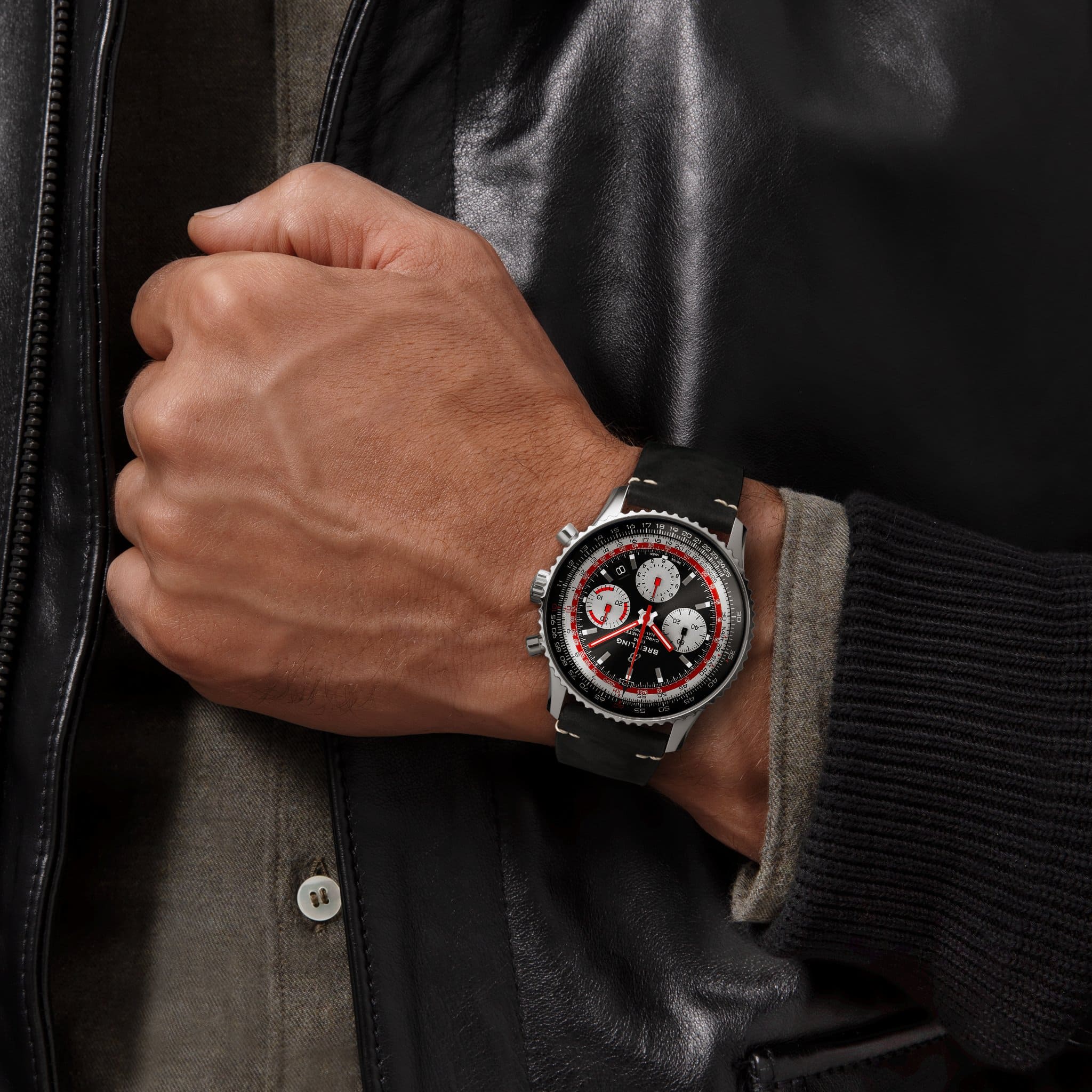Корпус из нержавеющей стали диаметром 43 миллиметра оснащен черным циферблатом и дополнительными серебристыми циферблатами. Модель дополняет черный кожаный ремешок в винтажном стиле с классической застежкой.