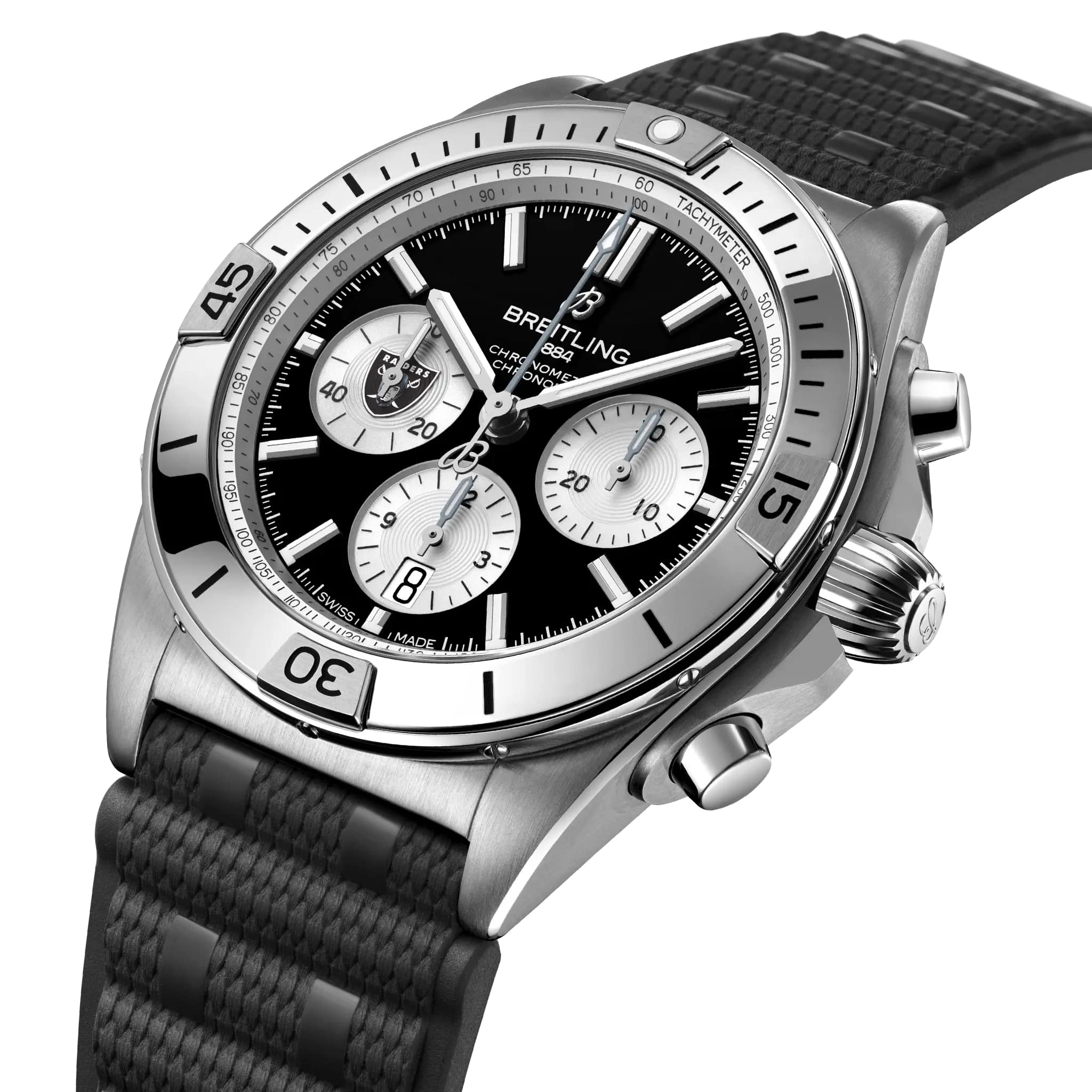 Мужские швейцарские часы-хронограф с секундомером Breitling B01 42 NFL Las Vegas Raiders Edition AB01342B1B1S1, механический механизм (автоматический калибр) с высокой точностью. Сапфировое стеклоСапфировое стеклоПрочный и надёжный материал из кристалла сапфира синтетического происхождения, характеризующийся особой твёрдостью и устойчивостью к царапинам и повреждениям. устойчивое к появлению царапин, обладающее высокой прозрачностью. Класс водозащиты: 200 метров, позволит плавать, нырять и заниматься другими водными видами спорта. Корпус часов изготовлен из нержавеющей стали. Браслет из каучука на раскладной застёжкеРаскладная застёжкаТакой тип застёжки используется только на браслетах из металла. Она никогда не раскрывается полностью, происходит разделение на 2 и более частей. Раскладывающая застёжка снизит вероятность потери часов к минимуму.. Стрелки и метки с люминесцентным покрытиемЛюминесцентное покрытиеПозволяет считывать показания времени в темноте. Производители наносят на стрелки, часовые индексы, безель или поверхность циферблата светонакопительный состав, дающий холодное свечение.. Шкала тахиметра на циферблате. Окошко даты находится в положении 6 часов.