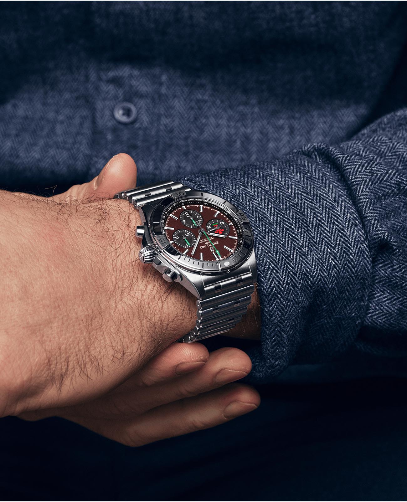 Лимитированные мужские швейцарские часы-хронографХронографФункция позволяет измерять отрезки времени с особой точностью: часы, минуты, секунды. Верным признаком хронографа является наличие на циферблате 3 дополнительных окошек-счётчиков. с секундомеромСекундомерСекундоме́р — прибор, способный измерять интервалы времени с точностью до долей секунды. Breitling Chronomat B01 42 Wales AB0134A61K1A1, механический механизм (автоматический калибр) с высокой точностью. Основанный на хронографе Frecce Tricolori, который был разработан и выпущен в 1983 году в сотрудничестве со знаменитой итальянской авиационной эскадрильей, Chronomat стильно отпраздновал столетие Breitling и ознаменовал возвращение механическому хронографу его законного места в бренде, который построил свою мировую репутацию на этих невероятных часах. Сапфировое стеклоСапфировое стеклоПрочный и надёжный материал из кристалла сапфира синтетического происхождения, характеризующийся особой твёрдостью и устойчивостью к царапинам и повреждениям. устойчивое к появлению царапин, обладающее высокой прозрачностью. Класс водозащиты: 200 метров, позволит плавать, нырять и заниматься другими водными видами спорта. Корпус и браслет часов изготовлены из нержавеющей стали. Часы имеют сертификат COSCСертификат COSCОфициальный сертификат, подтверждающий то, что часы ходят с особо высокой точностью. Для получения документа часы подвергаются тестовым испытаниям, разработанным швейцарским институтом тестирования хронометров COSC. Допустимая норма для механических часов -4/+6 секунд в день, для кварцевых моделей +/- 0,07 секунд в день.. Стрелки и метки с люминесцентным покрытиемЛюминесцентное покрытиеПозволяет считывать показания времени в темноте. Производители наносят на стрелки, часовые индексы, безель или поверхность циферблата светонакопительный состав, дающий холодное свечение.. Шкала тахиметраТахиметрРазмеченная шкала, располагается на ободке или безеле часов. Тахиметр позволяет рассчитать скорость на определённом участке пути, расстояние измеряется в километрах или милях. на циферблате. Окошко даты находится в положении 6 часов. Браслет с застёжкой-бабочкой с кнопкамиЗастёжка "бабочка"Такой вид застёжки дополняется предохранителями, помогающими избежать случайного раскрытия браслета. Обладают изящным исполнением. .