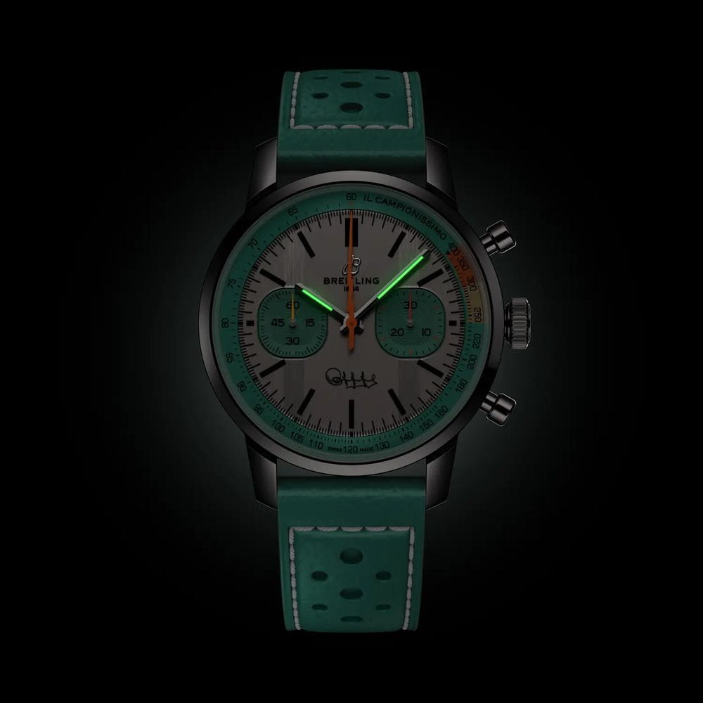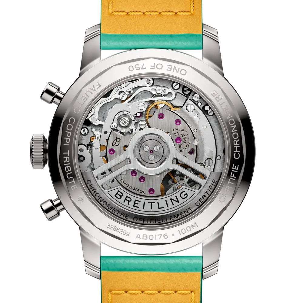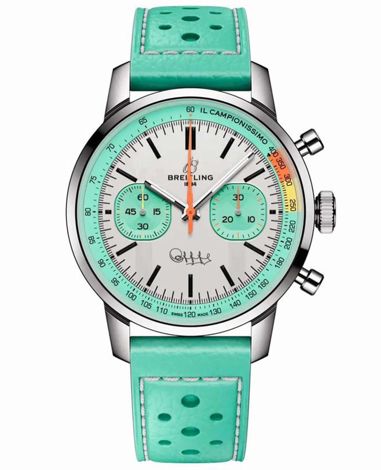 Breitling Top Time B01 Fausto Coppi AB01768A1A1X1 — лимитированные часы, вдохновлённые легендой велоспорта Фаусто Коппи и эстетикой ретро-хронографов 60-х годов. Корпус диаметром 41 мм выполнен из нержавеющей стали с комбинированной сатинированной и полированной отделкой. Прозрачная задняя крышка с гравировкой «Fausto Coppi Tribute» и «One of 750» подчёркивает уникальность выпуска. Циферблат защищён сапфировым стекломСапфировое стеклоПрочный и надёжный материал из кристалла сапфира синтетического происхождения, характеризующийся особой твёрдостью и устойчивостью к царапинам и повреждениям. с антибликовым покрытиемАнтибликовое покрытиеСлой оксида металла в 0,13-0,3 микрон, благодаря которому стекло часов не бликует и не отражает свет. Антибликовое покрытие уменьшает отражение света в 10 раз, обеспечивая отличную читаемость показателей циферблата.. Белый матовый циферблат украшен бирюзовыми субциферблатами и надписью «Il Campionissimo» по внешнему кругу. Подпись Fausto Coppi расположена на отметке 6 часов. Внутри установлен швейцарский автоматический калибр COSC-сертифицированныйСертификат COSCОфициальный сертификат, подтверждающий то, что часы ходят с особо высокой точностью. Для получения документа часы подвергаются тестовым испытаниям, разработанным швейцарским институтом тестирования хронометров COSC. Допустимая норма для механических часов -4/+6 секунд в день, для кварцевых моделей +/- 0,07 секунд в день. хронографХронографФункция позволяет измерять отрезки времени с особой точностью: часы, минуты, секунды. Верным признаком хронографа является наличие на циферблате 3 дополнительных окошек-счётчиков. Breitling B01, обеспечивающий точность, стабильность и запас хода до 70 часов. Модель укомплектована перфорированным кожаным ремешком бирюзового цвета, гармонирующим с деталями циферблата, и раскладной застёжкойРаскладная застёжкаТакой тип застёжки используется только на браслетах из металла. Она никогда не раскрывается полностью, происходит разделение на 2 и более частей. Раскладывающая застёжка снизит вероятность потери часов к минимуму.. Водонепроницаемость 100 метров делает часы надёжными не только в городе, но и в активной среде. Эта лимитированная модель — признание в любви к велоспорту и винтажной эстетике.