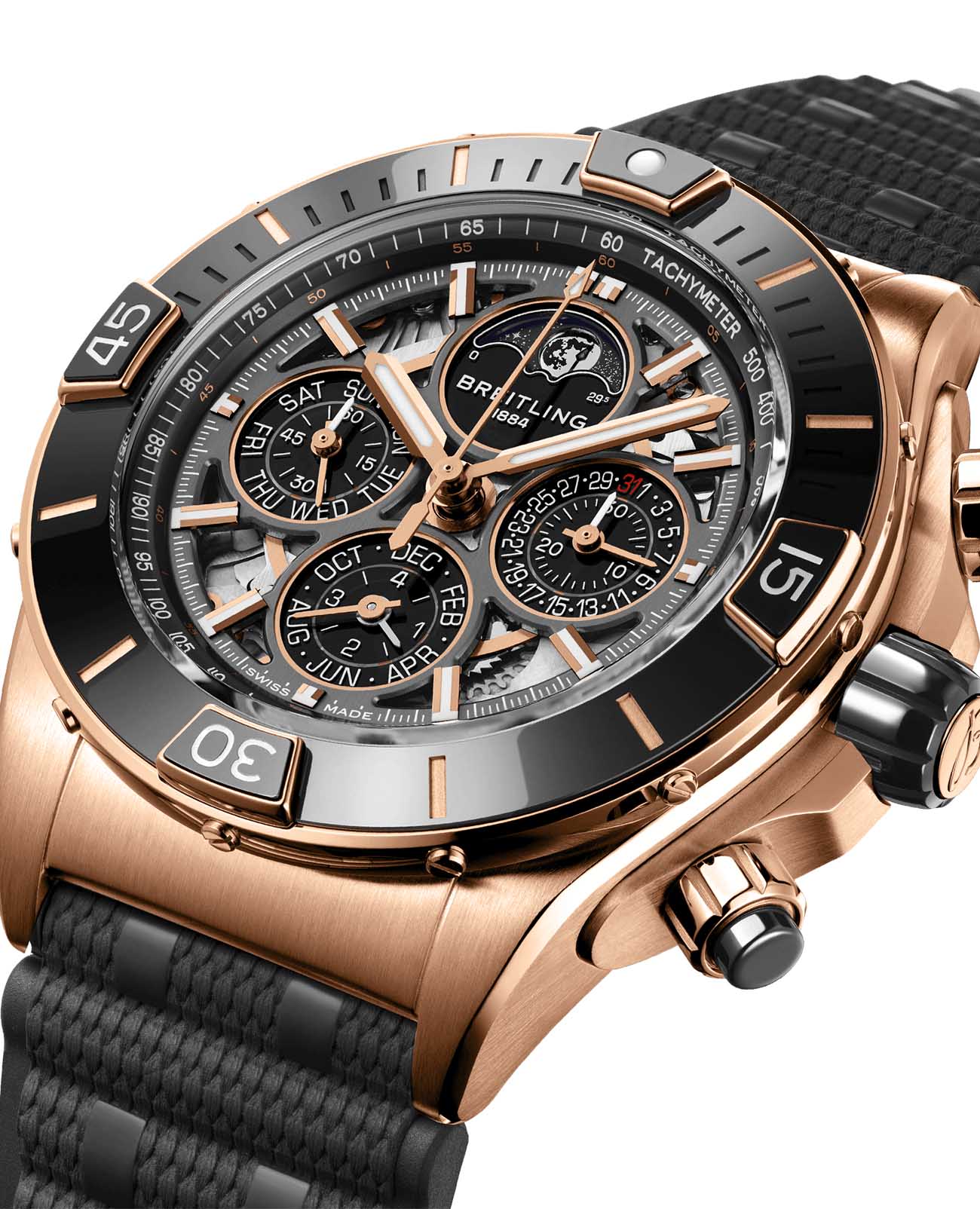 . Браслет из каучука на складной клипсе. Стрелки и метки с люминесцентным покрытиемЛюминесцентное покрытиеПозволяет считывать показания времени в темноте. Производители наносят на стрелки, часовые индексы, безель или поверхность циферблата светонакопительный состав, дающий холодное свечение.. Шкала тахиметра на циферблате. Окошко даты находится в положении 6 часов. Калибр Мануфактурный механизм Breitling Caliber 19. Запас хода 96 часов.