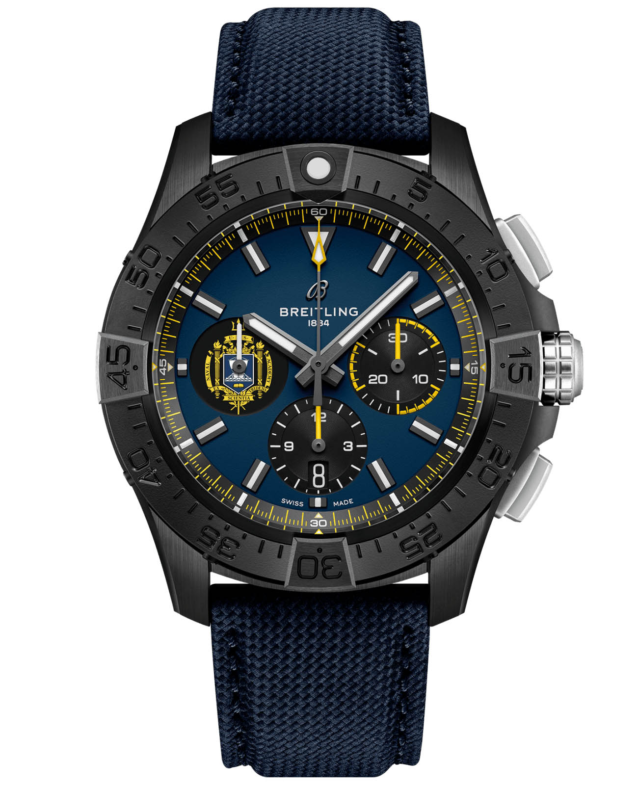 Мужские швейцарские часы-хронографХронографФункция позволяет измерять отрезки времени с особой точностью: часы, минуты, секунды. Верным признаком хронографа является наличие на циферблате 3 дополнительных окошек-счётчиков. с автоподзаводом Breitling Avenger B01 Chronograph 44 Night Mission Us Naval Academy SB01474A1C1X1. Сапфировое стеклоСапфировое стеклоПрочный и надёжный материал из кристалла сапфира синтетического происхождения, характеризующийся особой твёрдостью и устойчивостью к царапинам и повреждениям. устойчивое к появлению царапин, обладающее высокой прозрачностью. Класс водозащиты: 300 метров, позволит плавать, нырять и заниматься другими водными видами спорта. Корпус часов изготовлен из керамики. Стрелки и метки с люминесцентным покрытиемЛюминесцентное покрытиеПозволяет считывать показания времени в темноте. Производители наносят на стрелки, часовые индексы, безель или поверхность циферблата светонакопительный состав, дающий холодное свечение.. Шкала тахиметра на циферблате. Окошко даты находится в положении 6 часов. Кожаный ремешок на раскладной застёжкеРаскладная застёжкаТакой тип застёжки используется только на браслетах из металла. Она никогда не раскрывается полностью, происходит разделение на 2 и более частей. Раскладывающая застёжка снизит вероятность потери часов к минимуму..