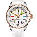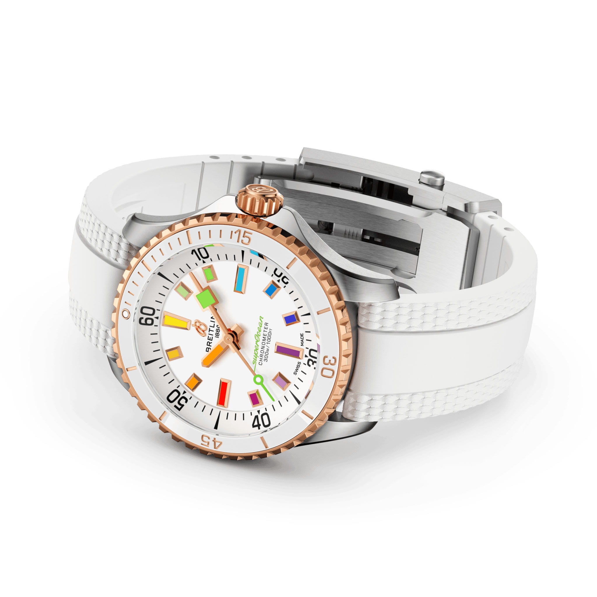 . Каучуковый ремешок на раскладной застёжкеРаскладная застёжкаТакой тип застёжки используется только на браслетах из металла. Она никогда не раскрывается полностью, происходит разделение на 2 и более частей. Раскладывающая застёжка снизит вероятность потери часов к минимуму.. Новый Superocean повторяет знаменитые дизайнерские коды Slow Motion, добавляя при этом современные элементы, такие как безель с керамической вставкой и яркие циферблаты. Стрелки и метки с люминесцентным покрытиемЛюминесцентное покрытиеПозволяет считывать показания времени в темноте. Производители наносят на стрелки, часовые индексы, безель или поверхность циферблата светонакопительный состав, дающий холодное свечение.. Вращающийся стальной безельБезельВнешний ободок, закрепляющий стекло. В спортивных часах так называется поворотное кольцо с делениями на циферблате, выполняет роль таймера – замеряет отрезки времени на шкале. Неподвижный безель – элемент декора. Однонаправленно вращающийся безель на дайверских часах позволяет фиксировать моменты погружения и выныривания на поверхность. с люминесцентным покрытием Superluminova из нержавеющей стали и керамики, защищенный от царапин, никогда не изнашивается и не выцветает. Лучше всего то, что это больше не просто часы для дайвинга — занимайтесь с ними серфингом, плавайте с ними, заходите с ними в пляжный бар, а затем надевайте их на ужин. Superocean идеально сочетает ностальгию по своему наследию со свежим внешним видом.