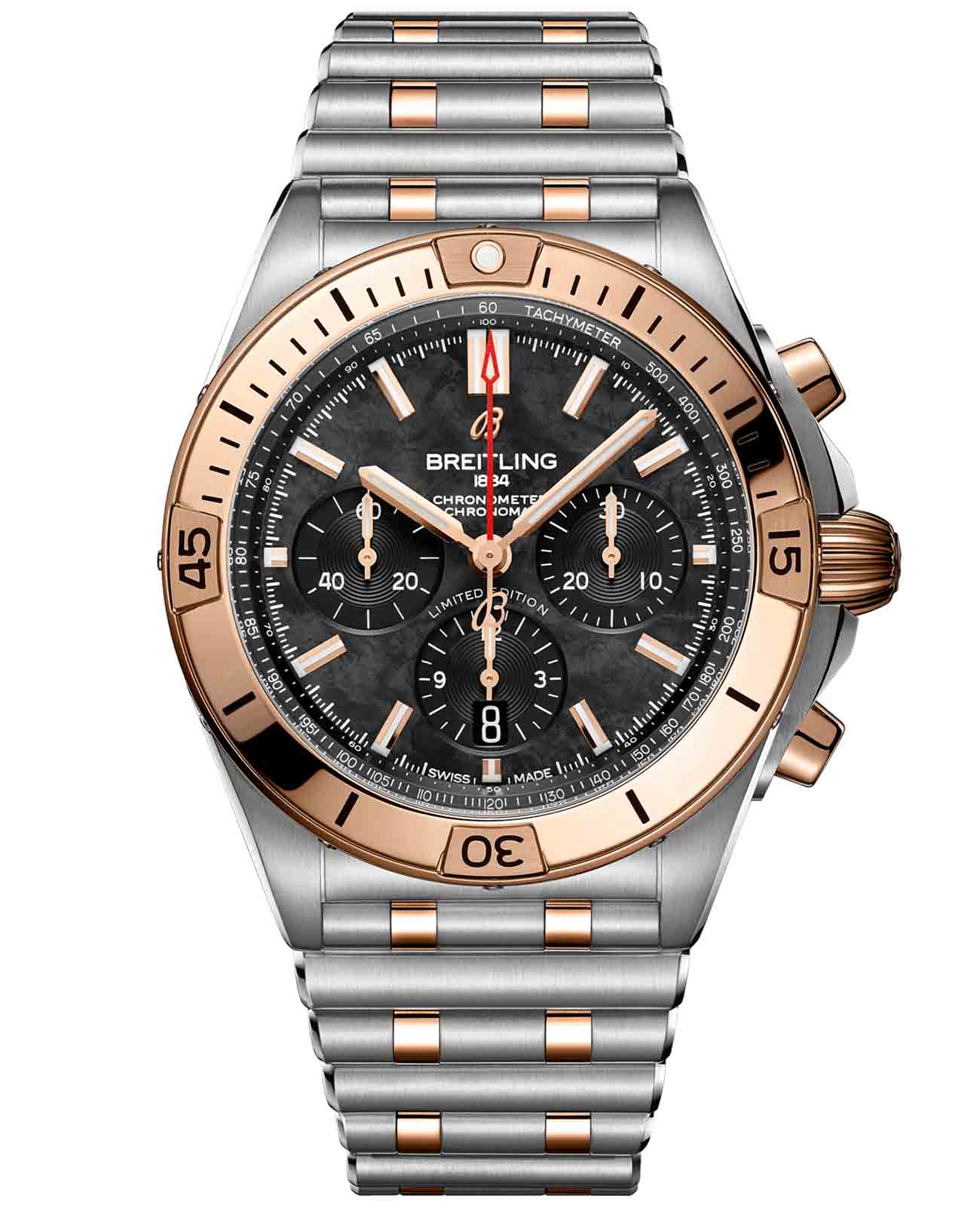 Лимитированные мужские швейцарские часы-хронографХронографФункция позволяет измерять отрезки времени с особой точностью: часы, минуты, секунды. Верным признаком хронографа является наличие на циферблате 3 дополнительных окошек-счётчиков. с секундомеромСекундомерСекундоме́р — прибор, способный измерять интервалы времени с точностью до долей секунды. Breitling Chronomat B01 42 UB01341A1B1U1, механический механизм (автоматический калибр) с высокой точностью. Основанный на хронографе Frecce Tricolori, который был разработан и выпущен в 1983 году в сотрудничестве со знаменитой итальянской авиационной эскадрильей, Chronomat стильно отпраздновал столетие Breitling и ознаменовал возвращение механическому хронографу его законного места в бренде, который построил свою мировую репутацию на этих невероятных часах. Сапфировое стеклоСапфировое стеклоПрочный и надёжный материал из кристалла сапфира синтетического происхождения, характеризующийся особой твёрдостью и устойчивостью к царапинам и повреждениям. устойчивое к появлению царапин, обладающее высокой прозрачностью. Класс водозащиты: 200 метров, позволит плавать, нырять и заниматься другими водными видами спорта. Корпус и браслет часов изготовлены из стали и 18-каратного золота18-каратное золотоОбозначение по каратной системе пробирования, оно показывает, сколько драгоценного металла содержится в изделии. 18 карат - в составе 75% чистого золота, соответствует 750 пробе.