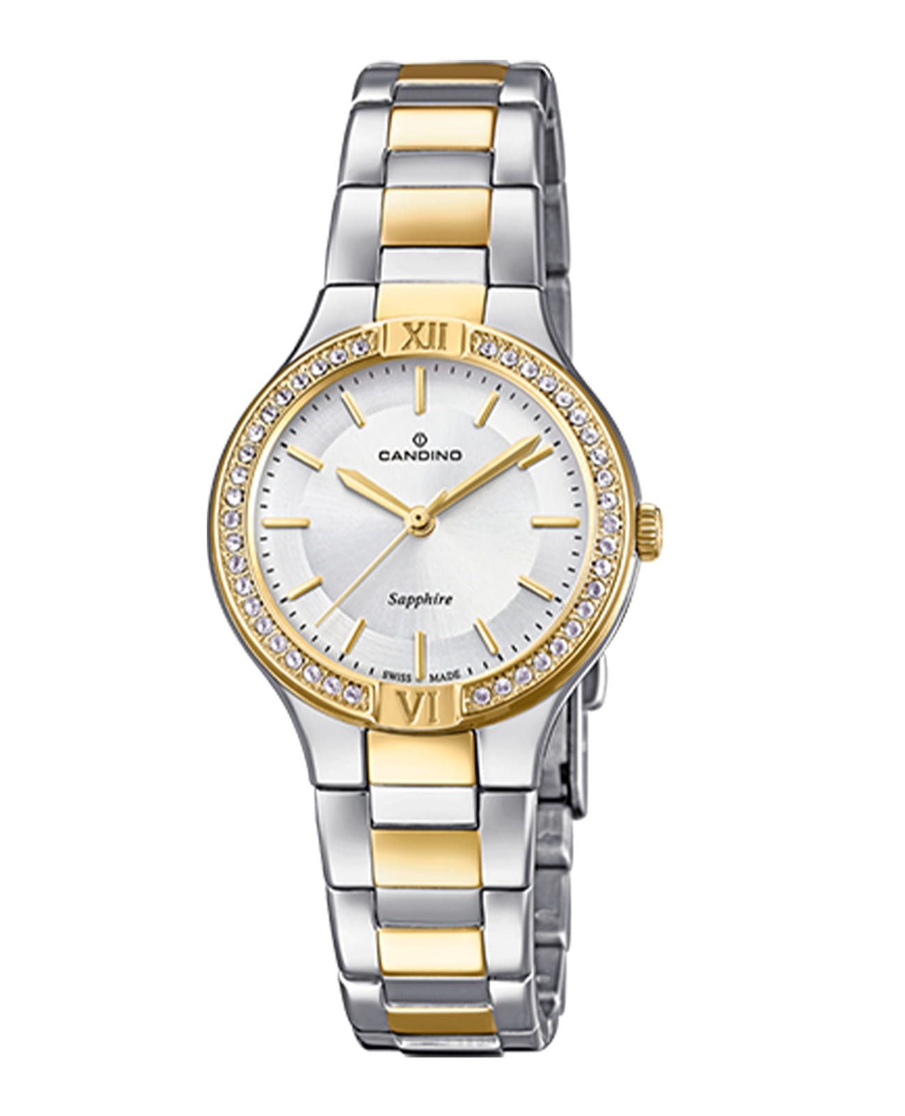 Женские швейцарские часы с кристаллами на безеле Candino Elegance C4627/1, кварцевый механизм с высокой точностью. Сапфировое стекло устойчивое к появлению царапин, обладающее высокой прозрачностью. Класс водозащиты: 50 метров, позволит защитить корпус от случайных брызг или капель дождя. Корпус часов изготовлен из стали, золотистого цвета.