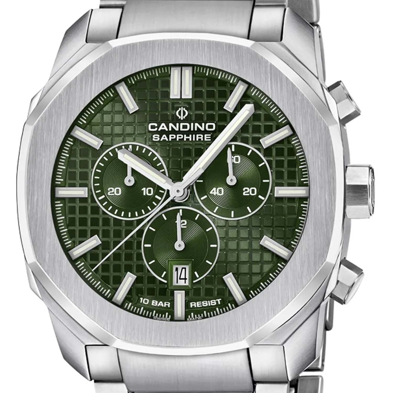 Швейцарские мужские наручные часы-хронографХронографФункция позволяет измерять отрезки времени с особой точностью: часы, минуты, секунды. Верным признаком хронографа является наличие на циферблате 3 дополнительных окошек-счётчиков. Candino Chronos Carree C4746/3, кварцевый механизм с высокой точностью. Сапфировое стеклоСапфировое стеклоПрочный и надёжный материал из кристалла сапфира синтетического происхождения, характеризующийся особой твёрдостью и устойчивостью к царапинам и повреждениям. устойчивое к появлению царапин, обладающее высокой прозрачностью. Часы, минуты, секунды. Окошко даты находится в положении 3 часа. Класс водозащиты: 100 метров, позволит плавать, нырять и заниматься другими водными видами спорта. Корпус часов изготовлен из нержавеющей стали. Стрелки и метки с люминесцентным покрытиемЛюминесцентное покрытиеПозволяет считывать показания времени в темноте. Производители наносят на стрелки, часовые индексы, безель или поверхность циферблата светонакопительный состав, дающий холодное свечение.. Стальной браслет на раскладной застёжкеРаскладная застёжкаТакой тип застёжки используется только на браслетах из металла. Она никогда не раскрывается полностью, происходит разделение на 2 и более частей. Раскладывающая застёжка снизит вероятность потери часов к минимуму..