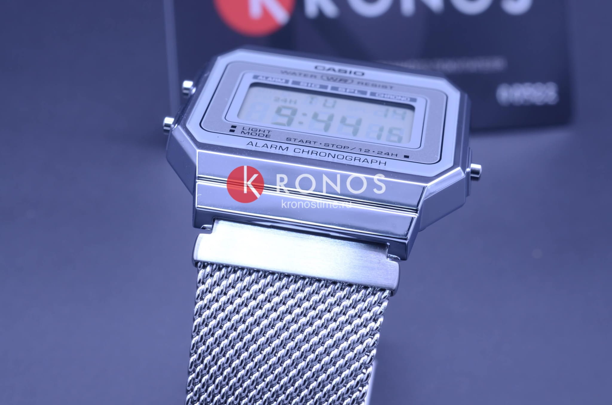 Серебристая цветовая гамма подойдёт к любой одежде, предоставляя простор для экспериментов. Цифровой дисплей оснащён функцией подсветки, облегчающей считывание информации в темноте. Среди дополнительных возможностей числятся будильник, календарь, секундомер. Ударопрочный корпус сделан из полимерного пластика. Стильный браслет миланского плетения. Минеральное стекло отличается устойчивостью к появлению царапин. Габариты: 38,6 x 36,3 x 9,6 мм.