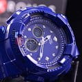 Аксессуар по достоинству оценят модницы, придерживающиеся активного образа жизни. Синий циферблат украшают металлические стразы, используемые вместо часовых индексов.Ударопрочный корпусУдаропрочный корпусМеханизм заключён в корпус, выполненный из современных материалов, устойчивых к ударам, механическим повреждениям и падению с высоты: инновационный пластик, карбон, нержавеющая сталь, титан. защищает японский кварцевый калибр, получающий энергию от батарейки. Срок её службы рассчитан на 2 года. Для подсветки используется LED-светодиодСветодиодная подсветкаСветодиодная или LED-подсветка обеспечивает появление яркого холодного свечения за счёт LED-элементов - маленьких лампочек. Они потребляют минимальное количество энергии, чаще всего можно встретить 1 светодиод, в нижней части циферблата.. Закаленное минеральное стекло.Водонепроницаемость до 10 бар. Гибкий, надёжный полимерный браслет. Ежечасный сигнал. Стрелки с покрытием NeobriteПодсветка NeobriteИспользование светонакопительных составов на основе сульфида цинка или алюмината стронция, яркий свет можно наблюдать на протяжении 6-10 часов после «зарядки» часов около источника света.. хронографХронографФункция позволяет измерять отрезки времени с особой точностью: часы, минуты, секунды. Верным признаком хронографа является наличие на циферблате 3 дополнительных окошек-счётчиков., таймер с автоповтором, UTCUTCВсемирное кординационное время, не имеющее привязки к географическому положению Гринвича, основывается на атомном отсчёте времени. Регулировка времени осуществляется более точно, чем устаревшее GMT.