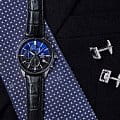 Лаконичный синий циферблат со счётчиками в автомобильной стилистике будет великолепно смотреться как с классическим пиджаком, так и со спортивной одеждой. Контрастные стрелки и метки обеспечивают удобную читаемость показателей. Часы отличаются ударопрочным корпусомУдаропрочный корпусМеханизм заключён в корпус, выполненный из современных материалов, устойчивых к ударам, механическим повреждениям и падению с высоты: инновационный пластик, карбон, нержавеющая сталь, титан. из нержавеющей стали 316L, металлический блеск которой гармонирует с чёрной кожей ремешка. Японский кварцевый механизм с точностью хода +/- 30 секунд в месяц. Аккумулятор рассчитан на 2 года работы. Закручивающаяся задняя крышка. Яркая люминесцентная подсветка NeobriteПодсветка NeobriteИспользование светонакопительных составов на основе сульфида цинка или алюмината стронция, яркий свет можно наблюдать на протяжении 6-10 часов после «зарядки» часов около источника света.. Водостойкость 10 бар. Стекло из сапфира устойчиво к появлению царапин. ХронографХронографФункция позволяет измерять отрезки времени с особой точностью: часы, минуты, секунды. Верным признаком хронографа является наличие на циферблате 3 дополнительных окошек-счётчиков., секундомер, апертура даты. Габариты: 51,4 x 43,8 x 10,9 мм.
