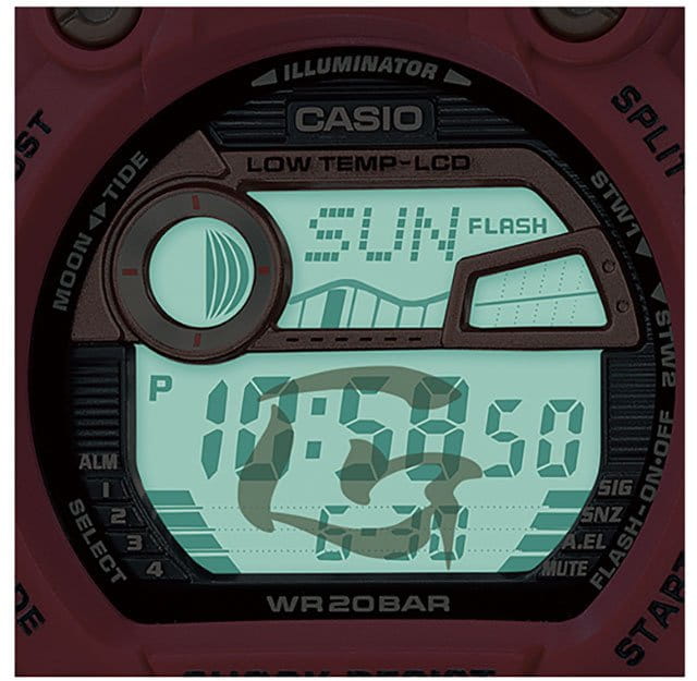 Аксессуар выпущен в честь «семи счастливых богов» из японской мифологии. Узнаваемой чертой дизайна стали 4 винта на лицевой части противоударного корпусаУдаропрочный корпусМеханизм заключён в корпус, выполненный из современных материалов, устойчивых к ударам, механическим повреждениям и падению с высоты: инновационный пластик, карбон, нержавеющая сталь, титан., крупные кнопки с ребристой поверхностью и многочисленные узоры. Это подходящий вариант для любителей зимних видов спорта, так как среди свойств модели отмечается устойчивость к температурам даже ниже -20 °C. Японский кварцевый механизм работает от батарейки, срок её службы рассчитан на 2 года. Электролюминесцентная подсветкаЭлектролюминесцентная подсветкаЭлектролюминесцентная панель устанавливается под ЖК-экраном часов, при нажатии кнопки электричество преобразуется в свет за счёт подачи напряжения на атомы фосфора, такой тип подсветки позволяет освещать весь циферблат. полностью освещает циферблат. Минеральное стекло. Высокие показатели водонепроницаемости до 20 бар. Функции: отображение возраста и фаз луны, индикация графика приливов и отливов, секундомер, 5 будильников, мировое времяМировое время Полезное часовое усложнение, отображающее время в основных городах и известных областях по всему миру, оно связано с часовыми поясами, удобно для путешественников и бизнесменов. , календарь, таймер. Габариты: 46,2 x 45,4 x 13,6 мм.