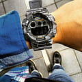 Наручные часы обладают внушительными размерами, благодаря массивному ударопрочному корпусуУдаропрочный корпусМеханизм заключён в корпус, выполненный из современных материалов, устойчивых к ударам, механическим повреждениям и падению с высоты: инновационный пластик, карбон, нержавеющая сталь, титан. и необычному дизайну они приметно смотрятся на запястье. Их поверхность имеет камуфляжный принт, циферблат же оставлен в минималистичном исполнении. Японский кварцевый механизм работает за счёт батарейки, срок службы которой составляет 7 лет. Корпус и браслет из высокопрочного пластика. Автоматическая светодиодная подсветкаСветодиодная подсветкаСветодиодная или LED-подсветка обеспечивает появление яркого холодного свечения за счёт LED-элементов - маленьких лампочек. Они потребляют минимальное количество энергии, чаще всего можно встретить 1 светодиод, в нижней части циферблата.. Закаленное минеральное стекло. Водозащита 200 метров. Включение и выключение функции кнопок. Функции: таймер обратного отсчёта, 5 будильников, хронографХронографФункция позволяет измерять отрезки времени с особой точностью: часы, минуты, секунды. Верным признаком хронографа является наличие на циферблате 3 дополнительных окошек-счётчиков., секундомер, мировое времяМировое время Полезное часовое усложнение, отображающее время в основных городах и известных областях по всему миру, оно связано с часовыми поясами, удобно для путешественников и бизнесменов. . Габариты: 55 x 51,2 x 17,4 мм.