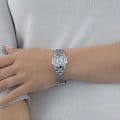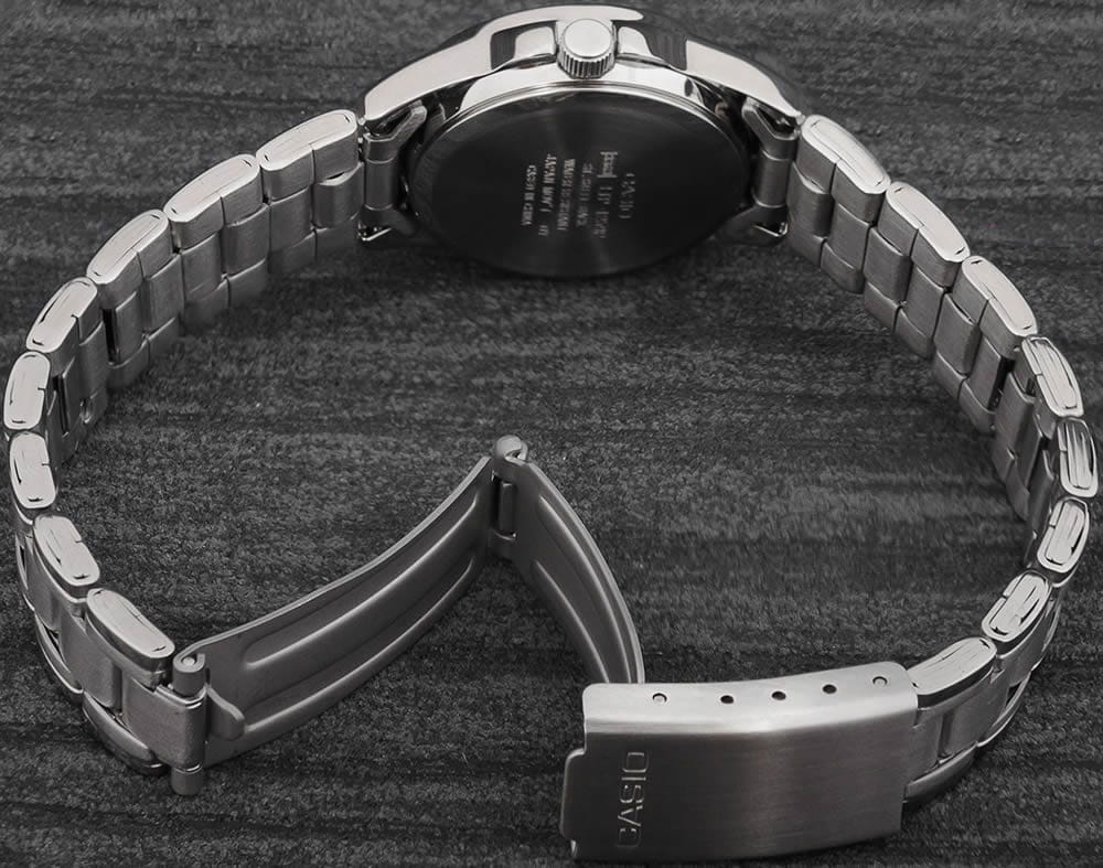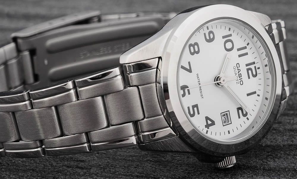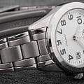 Преимуществами данной модели являются ее сдержанный дизайн и практичность. В качестве полезной функции на циферблате помимо времени показывается и текущая дата. Гладкий и гибкий серебристый браслет сделан из нержавеющей стали. Временны отметки представляют собой арабские цифры, которые расположены на круглом, белом циферблате. Часы оснащены неоновой подсветкой, которая приходит в действие после непродолжительной выдержи на свету. Вес аксессуара составляет 56 грамм.