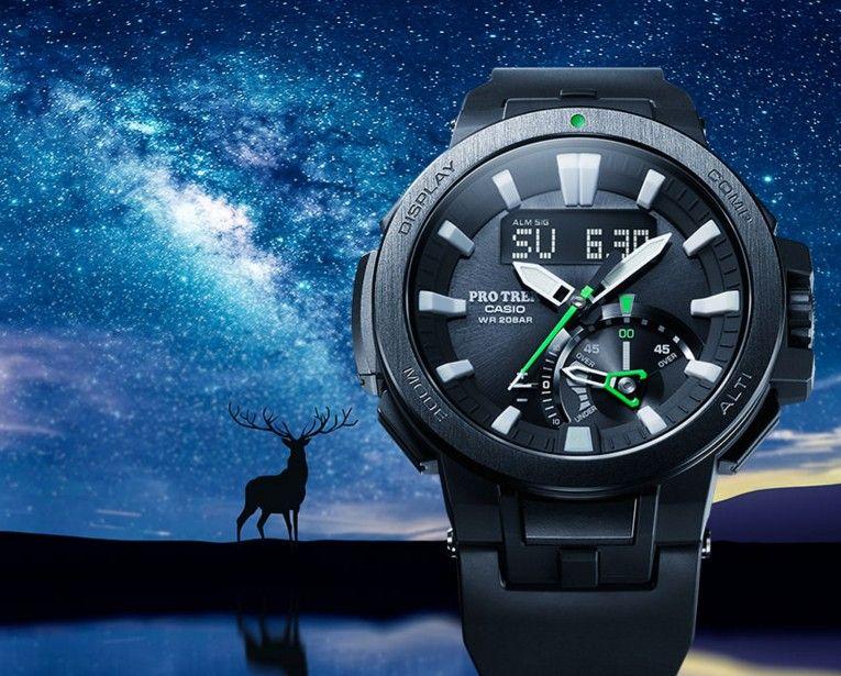 Модель с зелёными деталями отражает спортивный стиль и выигрышно смотрится на запястье. Ударопрочный корпусУдаропрочный корпусМеханизм заключён в корпус, выполненный из современных материалов, устойчивых к ударам, механическим повреждениям и падению с высоты: инновационный пластик, карбон, нержавеющая сталь, титан. выполнен из пластика и стали 316L с IP-покрытиемIP-покрытиеМетод ионного напыления. Демонстрирует повышенную устойчивость к истиранию, окислению и химическим веществам. Под воздействием высокого давления и температуры около 1500°C молекулы металла надёжно соединяются с частицами корпуса часов., что делает его устойчивым к различным видам повреждений. Наручные часы с японским кварцевым механизмом работают от солнечной батареи , функция сохранения энергии увеличивает срок работы часов без подзарядки до 21 месяца. Сапфировое стекло с покрытием «антиблик». Двойная светодиодная подсветкаСветодиодная подсветкаСветодиодная или LED-подсветка обеспечивает появление яркого холодного свечения за счёт LED-элементов - маленьких лампочек. Они потребляют минимальное количество энергии, чаще всего можно встретить 1 светодиод, в нижней части циферблата.. Водостойкость 20 бар. Устойчивость к температуре ниже -10°C. Коррекция времени радиосигналом, барометр, лунный календарь, высотомер, таймер, график восхода и заката солнца, датчик приливов и отливов, мировое времяМировое время Полезное часовое усложнение, отображающее время в основных городах и известных областях по всему миру, оно связано с часовыми поясами, удобно для путешественников и бизнесменов. – 31 часовой пояс, календарь, хронографХронографФункция позволяет измерять отрезки времени с особой точностью: часы, минуты, секунды. Верным признаком хронографа является наличие на циферблате 3 дополнительных окошек-счётчиков.. Таймер рыбалки подсказывает, какое время оптимально подходит для ловли рыбы. Габариты: 58,7 x 52,3 x 14,5 мм.