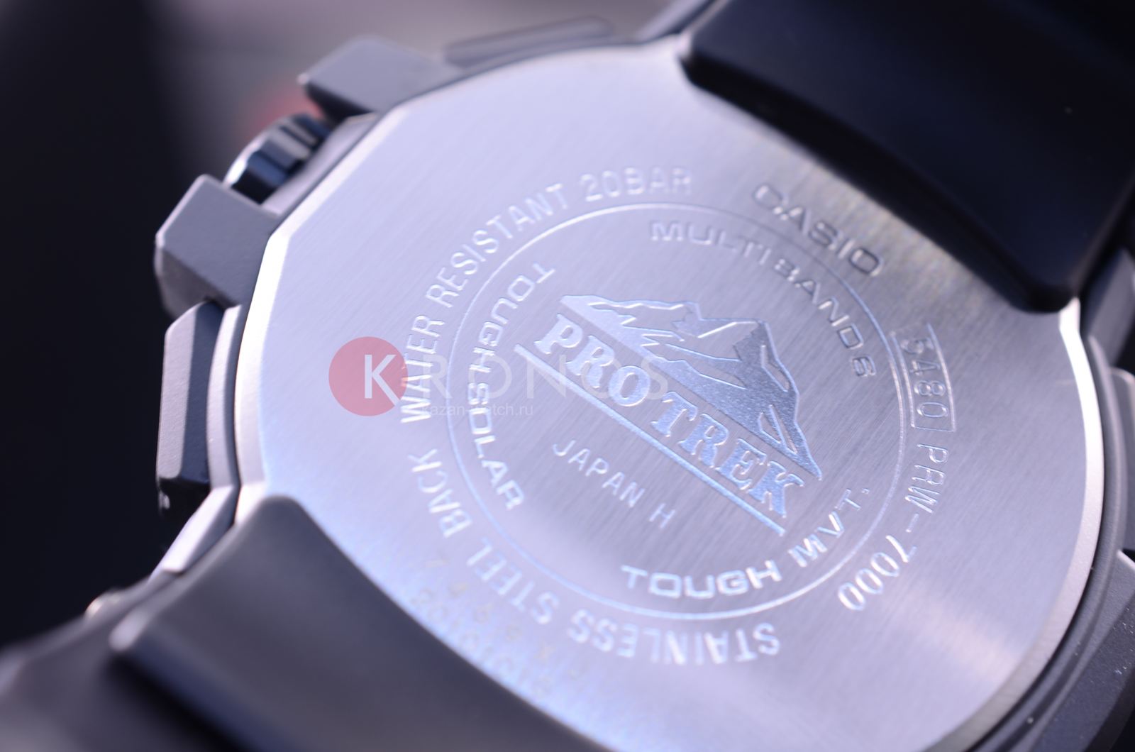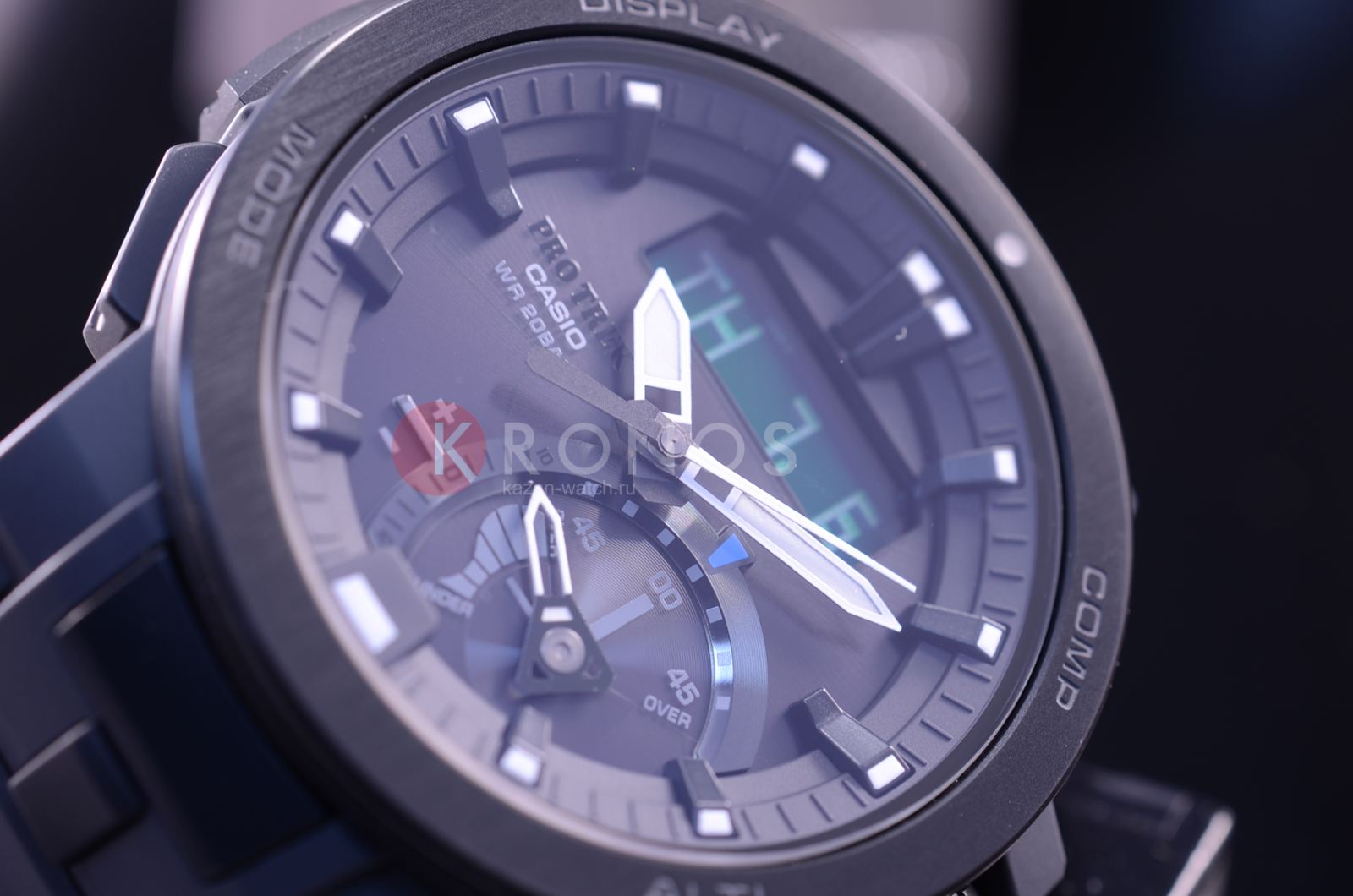 Многофункциональные, ударопрочные наручные кварцевые мужские часы на солнечной батарее. Циферблат темного цвета с контрастными элементами дизайна. Корпус часов выполнен из нержавеющей стали и пластика. На безеле нанесены часовые пояса. Сапфировое стекло, не царапается. Часы надежно удерживаются на руке ремешком из высокопрочного полимерного пластика цвета хаки. Водонепроницаемость 200М. Из дополнительных функций в часах присутствует: вечный календарь, секундомер, таймер обратного отсчета, высотомер, барометр, термометр, компас, индикатор запаса хода, второй часовой пояс, будильник (количество установок: 5), ежечасный сигнал, функция сохранения энергии, функция включения/отключения звука кнопок, функция перемещения стрелок; работоспособность в полной темноте до 6 месяцев в обычном режиме и до 23 месяцев в режиме сохранения энергии, прием радиосигнала для коррекции текущего времени, взрвст луны, уровень прилива.
