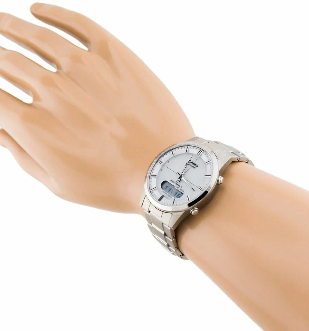 Японские титановые наручные часы c хронографомХронографФункция позволяет измерять отрезки времени с особой точностью: часы, минуты, секунды. Верным признаком хронографа является наличие на циферблате 3 дополнительных окошек-счётчиков. Casio Radio Controlled LCW-M170TD-7A, кварцевый механизм с высокой точностью. Сапфировое стекло устойчивое к появлению царапин, обладающее высокой прозрачностью. Класс водозащиты: 50 метров, позволит защитить корпус от случайных брызг или капель дождя. Корпус часов изготовлен из титана. Титановый браслет на раскладной застёжкеРаскладная застёжкаТакой тип застёжки используется только на браслетах из металла. Она никогда не раскрывается полностью, происходит разделение на 2 и более частей. Раскладывающая застёжка снизит вероятность потери часов к минимуму.. Питание от солнечной энергии, индикатор заряда батареи. Циферблат подсвечивается светодиодомСветодиодная подсветкаСветодиодная или LED-подсветка обеспечивает появление яркого холодного свечения за счёт LED-элементов - маленьких лампочек. Они потребляют минимальное количество энергии, чаще всего можно встретить 1 светодиод, в нижней части циферблата.. Подсветка NeobriteПодсветка NeobriteИспользование светонакопительных составов на основе сульфида цинка или алюмината стронция, яркий свет можно наблюдать на протяжении 6-10 часов после «зарядки» часов около источника света. обеспечивает длительное послесвечение в темноте даже после кратковременного нахождения на свету. Технология Multi Band 6 позволяет принимать сигналы от шести радиовышек, расположенных в различных точках земного шара, которые передают временные сигналы от определенных атомных часов. Коррекция текущего времени радиосигналом на территории почти всей Европы, США, Японии и Китая. СекундомерСекундомерСекундоме́р — прибор, способный измерять интервалы времени с точностью до долей секунды. с точностью показаний 1/10с и временем измерения 1ч. ТаймерТаймерОтсчитывает секунды в обратном направлении в заданном интервале времени. обратного отсчета от 1мин до 100мин. Мировое время. 12-ти и 24-х часовой формат времени. Выбор языка отображения дня недели и месяца. Функция включения/отключения звука.