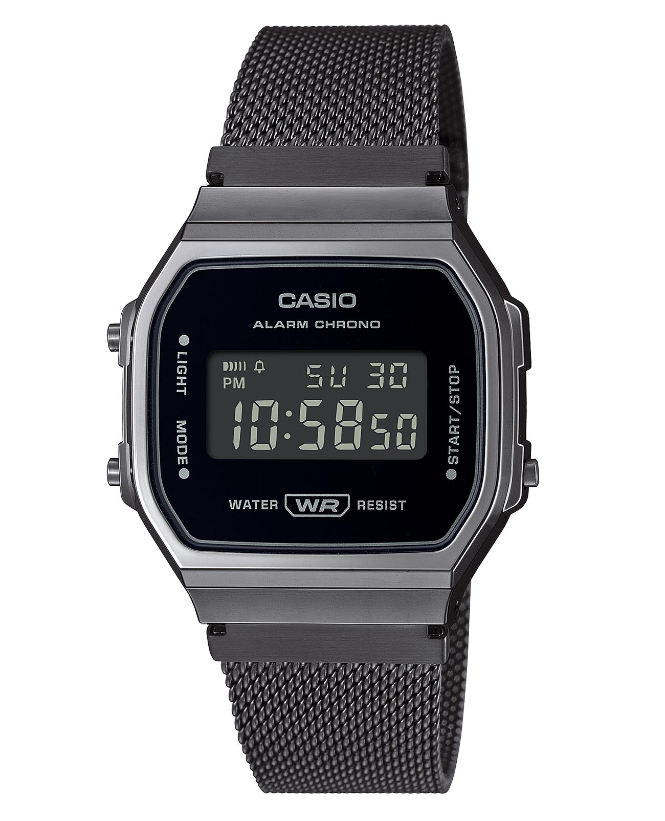 Японские мужские часы с хронографом Casio Vintage A168WEMB-1BDF (A168WEMB-1B), электронный механизм с высокой точностью. Класс водозащиты: 30 метров, позволит защитить корпус от случайных брызг или капель дождя. Корпус часов изготовлен из пластика, черного цвета.
